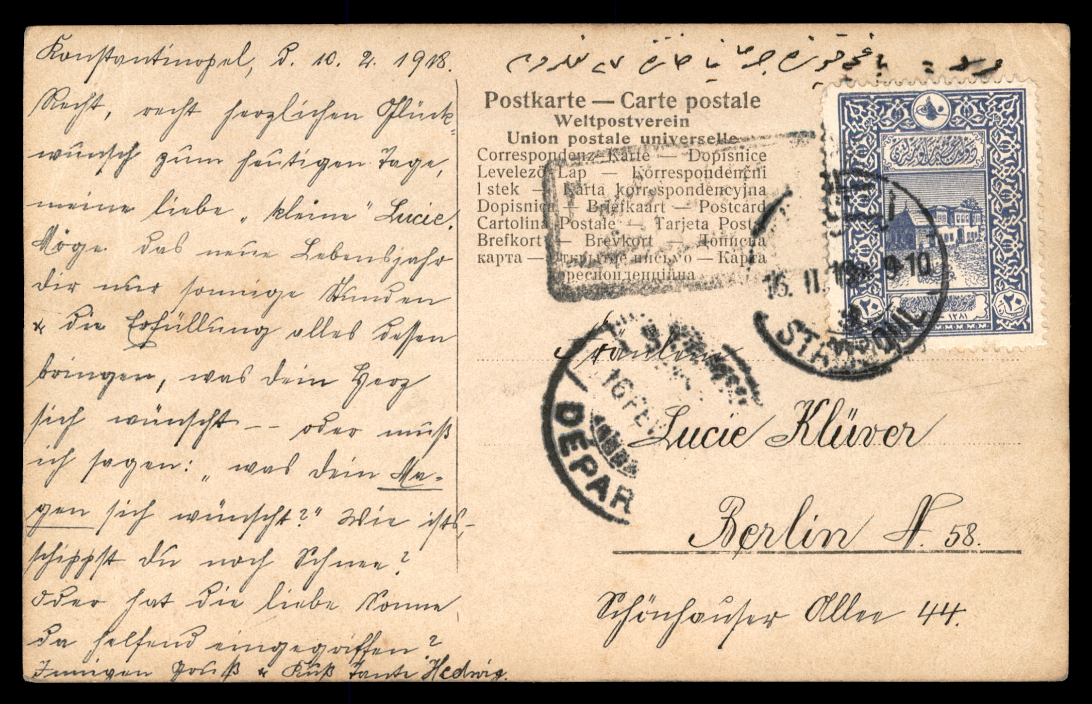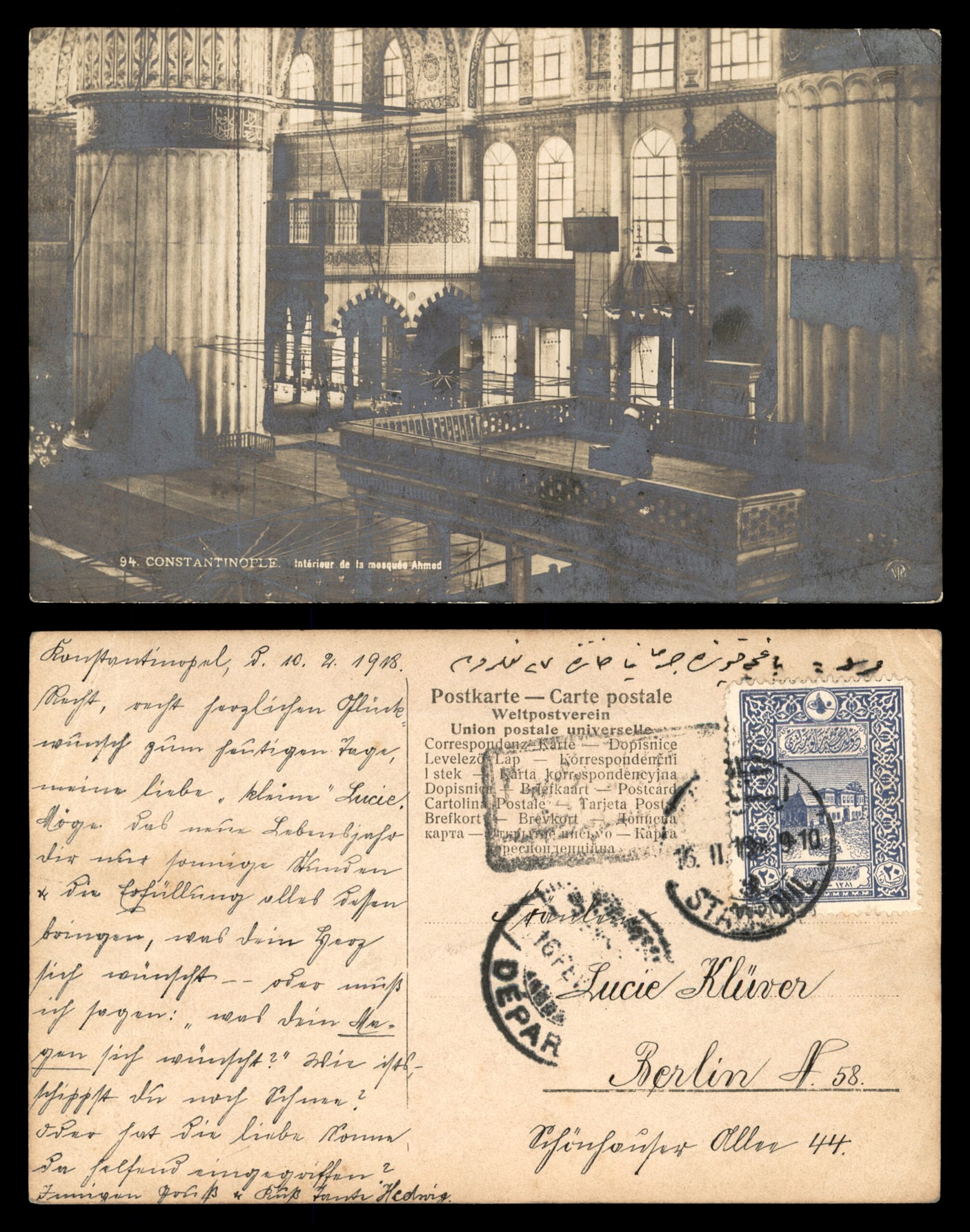 המכירותלוט 129 – גלויה פנים מסגד אחמד (מסגד הכחול) קונסטנטינופול 1905, בול עות'מאני, לברלין | Lot 129 – Constantinople Blue Mosque Interior Postcard 1905, Ottoman Stamp, to Berlin Germany