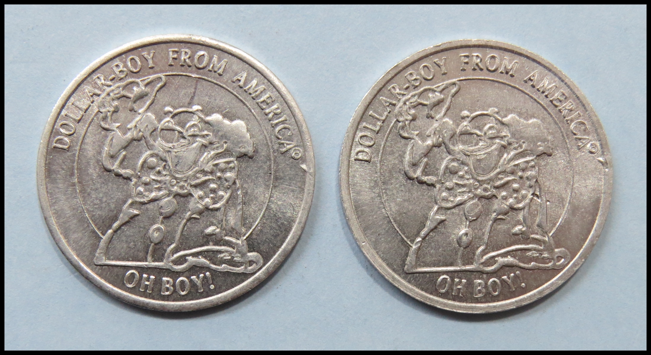 EN: A pair (×2) of **"DOLLAR-BOY FROM AMERICA® / OH BOY!"** novelty/souvenir coins/tokens — silver-colored metal medallions featuring a whimsical cartoon alien/robot character in raised relief. The inscription "DOLLAR-BOY FROM AMERICA" arcs across the top, and "OH BOY!" appears at the bottom, both in raised letters. The character design shows a quirky robotic/alien figure with large round eyes, mechanical limbs, and comic proportions. These novelty coins are associated with an Israeli children's/pop-culture brand — "Dollar-Boy from America" was a popular Israeli children's novelty character/brand of the 1990s-2000s, sold at souvenir shops and kiosks. Both coins are in very similar condition — nickel/silver-coloured metal alloy — displaying the same design. A fun and collectible piece of Israeli pop culture ephemera, appealing to both coin collectors and Israeli nostalgia enthusiasts.
