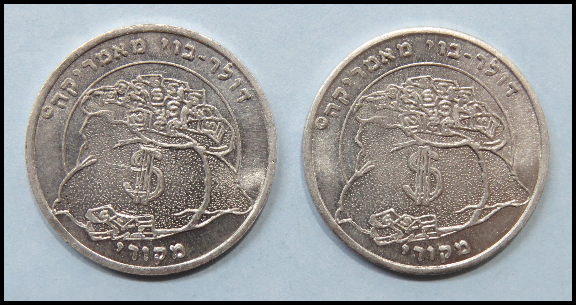 עב: זוג (×2) **מטבעות נובלטי "דולר-בוי מאמריקה® / OH BOY!"** — מדליות מתכת כסופות עם דמות קריקטורה של יצור מוזר/רובוט בתבליט. הכיתוב "DOLLAR-BOY FROM AMERICA" בקשת עליונה ו-"OH BOY!" בתחתית — שניהם בכתב תבליטי. מטבעות הנובלטי קשורים למותג ילדים/תרבות פופ ישראלי — "דולר-בוי מאמריקה" היה דמות/מותג נובלטי ישראלי פופולרי של שנות ה-90-2000, נמכר בחנויות מזכרות. שני המטבעות במצב דומה מאוד. פריט מהנה ונוסטלגי של תרבות פופ ישראלית.