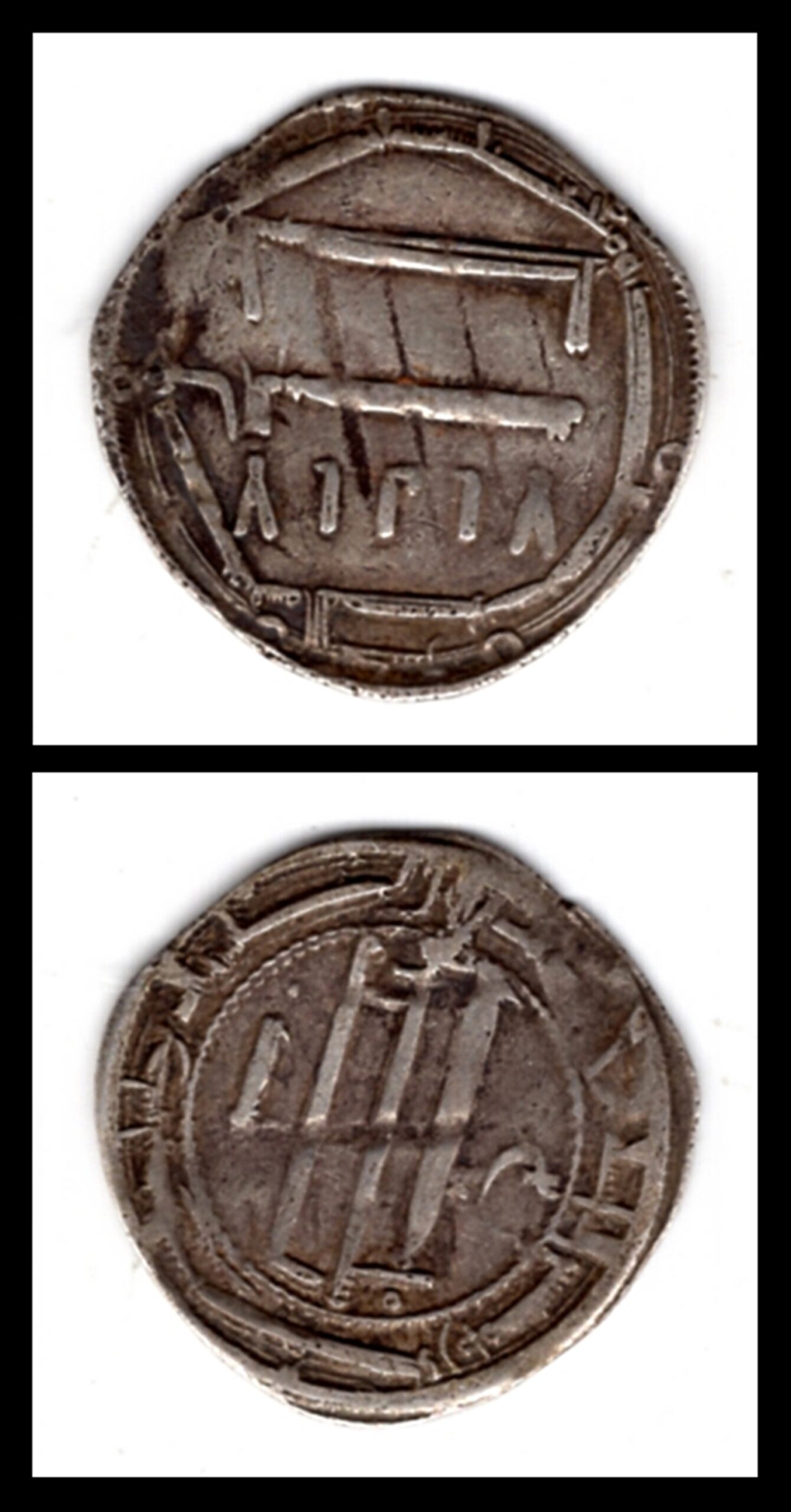 HE: דירהם כסף עבאסי מהתקופה האסלאמית המוקדמת. על המטבע כתב כופי ערבי משני הצדדים, אופייני למטבעות הח'ליפות העבאסית. בצד הקדמי הכרזת האמונה האסלאמית (שהאדה) ובצד האחורי שם הח'ליפה ומידע על בית המטבעה. כסף, מצב טוב עם כיתובים ברורים. פריט נומיסמטי מבוקש מאחת התקופות המשמעותיות ביותר בהיסטוריה האסלאמית.