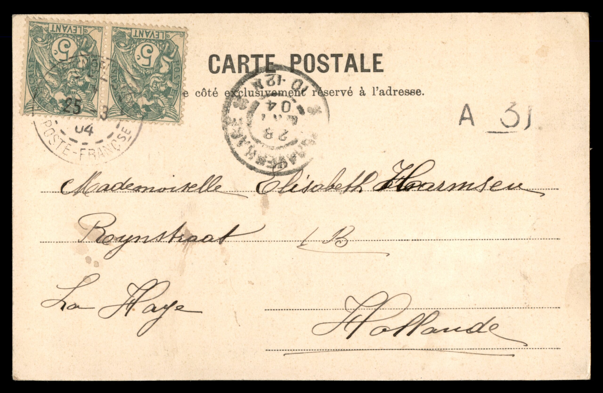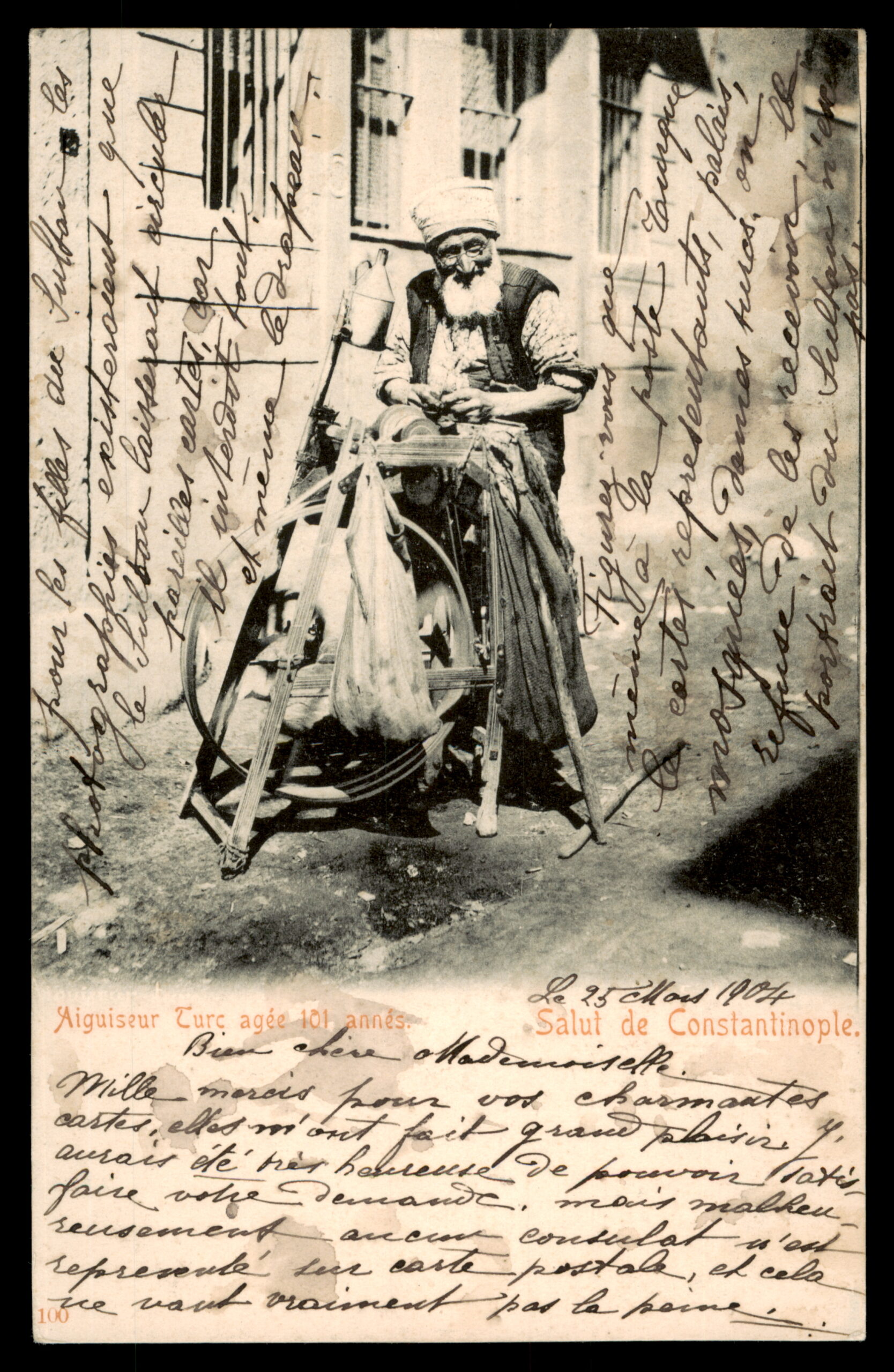 EN: Lot 181 – Vintage Ottoman postcard titled "Aiguiseur Turc agé 101 années – Salut de Constantinople," depicting an elderly Turkish knife grinder said to be 101 years old, working at his traditional grinding wheel on a Constantinople street. Extensively written message in French dated March 25, 1904. Franked with a pair of 5 centimes French Levant stamps, cancelled at the French Post Office in Constantinople (March 25, 1904). Addressed to Mademoiselle Elisabeth Harmsen, Rynstraat 1B, La Haye (The Hague), Holland. A remarkable ethnographic postcard capturing Ottoman street life with French Levant postal history.