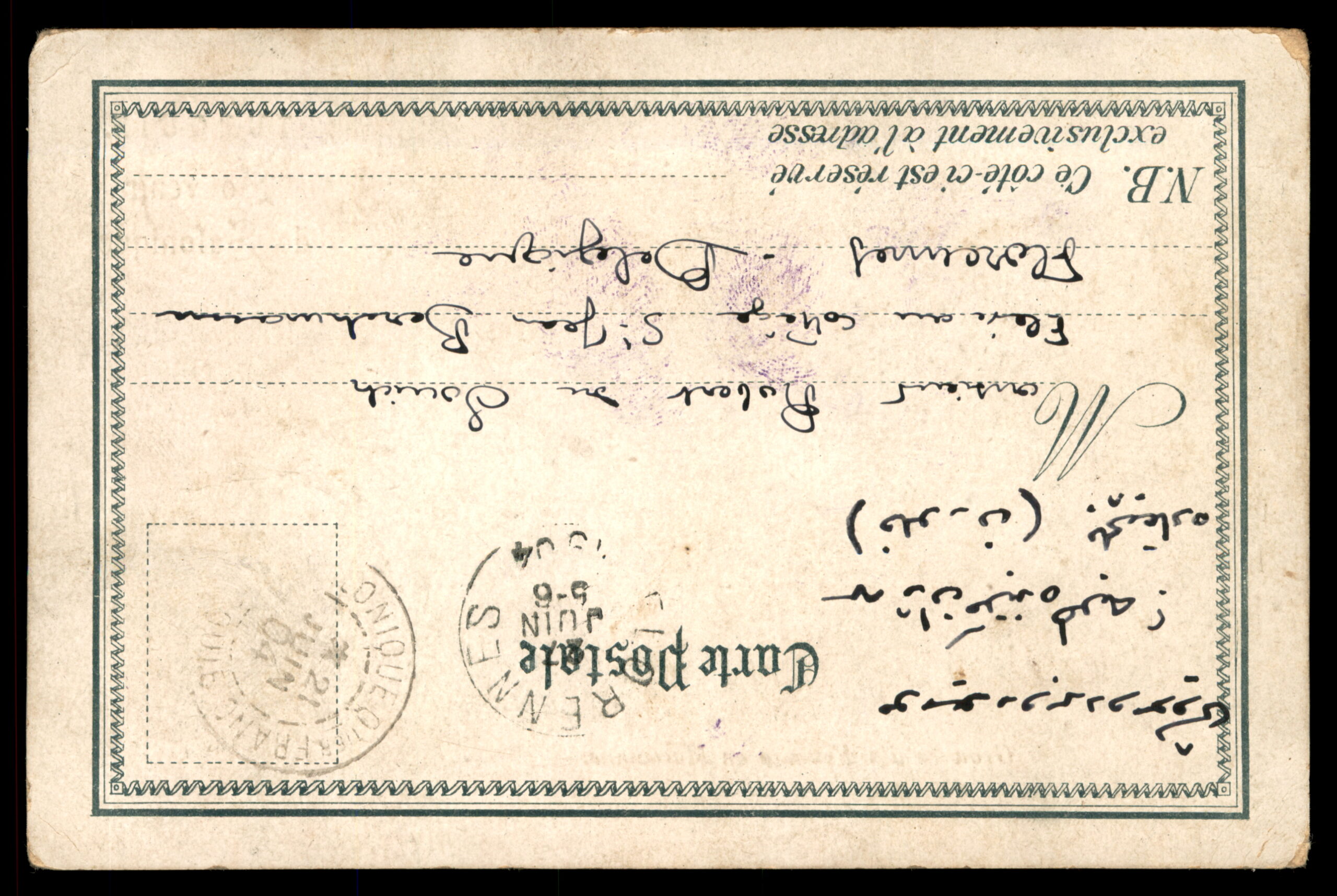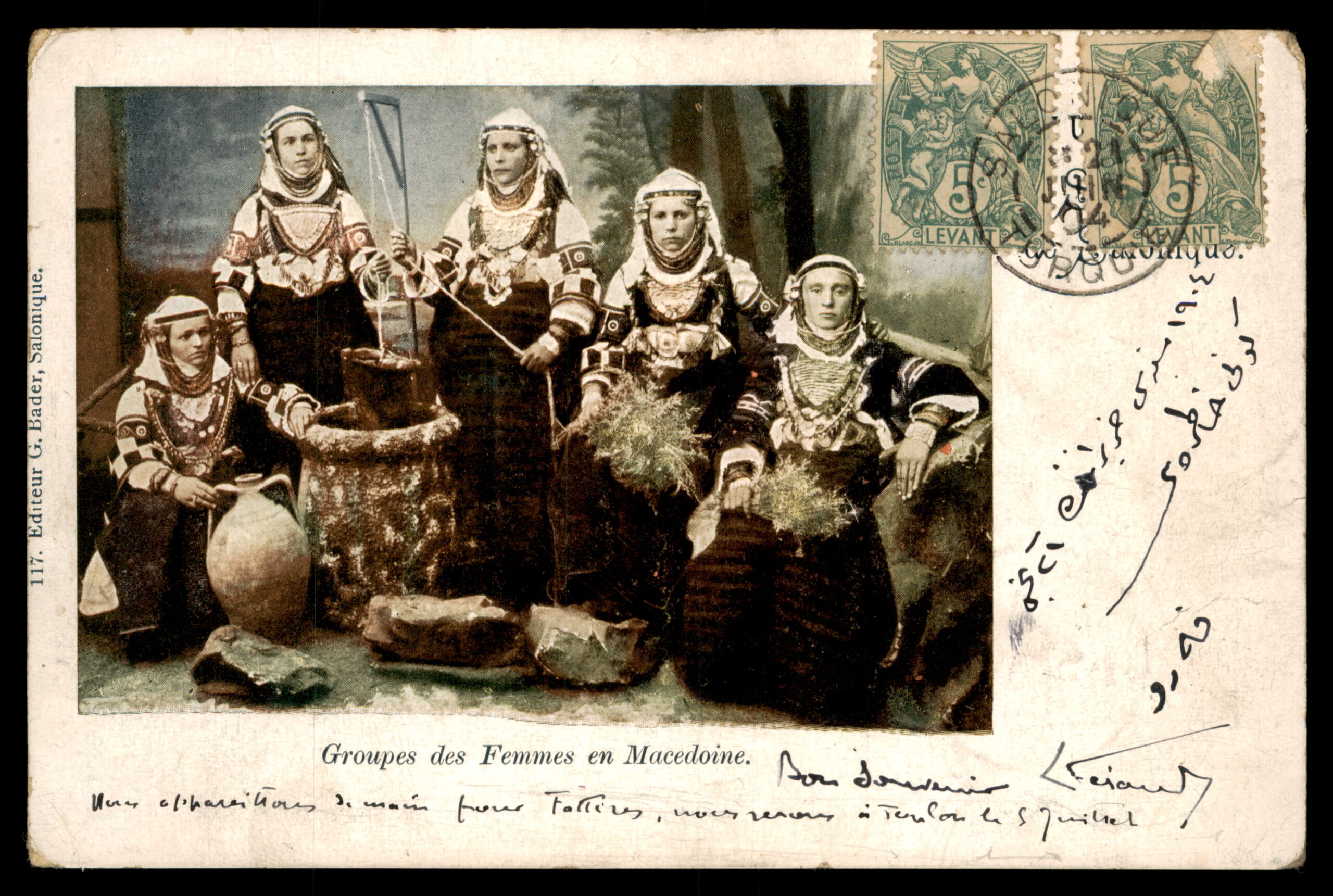 EN: Lot 203 – A postcard depicting a group of Macedonian women in elaborate traditional costumes with rich jewelry and headdresses (Groupes des Femmes en Macedoine). Published by G. Bader, Salonique, No. 117. Franked with pair of French Levant 5c stamps, cancelled at Salonique. Sent to Rennes, France, with arrival cancel (June 1904). Handwritten message in French on the picture side.