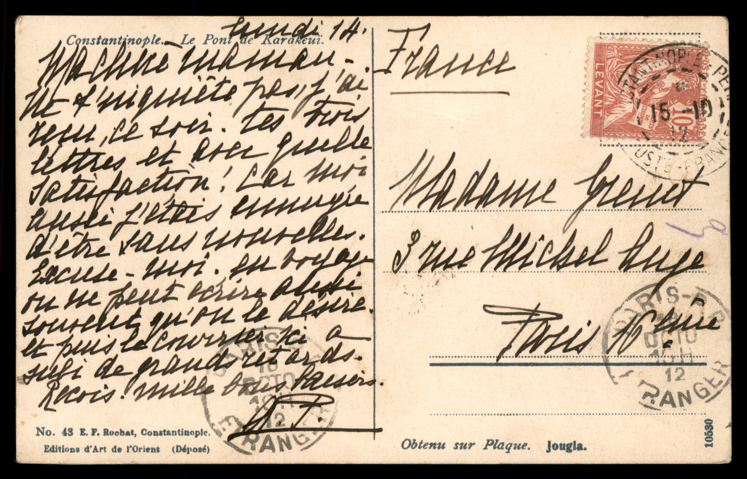 EN: Lot 207 – A magnificent colorized postcard of Constantinople depicting the Galata Bridge (Le Pont de Karakeui) with Ottoman figures in traditional dress, horse carriages, and a grand mosque (Süleymaniye) in the background. Published by E.F. Rochat, Constantinople, No. 43, Editions d'Art de l'Orient. Obtenu sur Plaque Jougla. Franked with French Levant 10c stamp, cancelled at Constantinople. Sent to Madame Genet, 3 rue Michel Ange, Paris 16ème, France. Paris arrival cancel. Handwritten message in French.