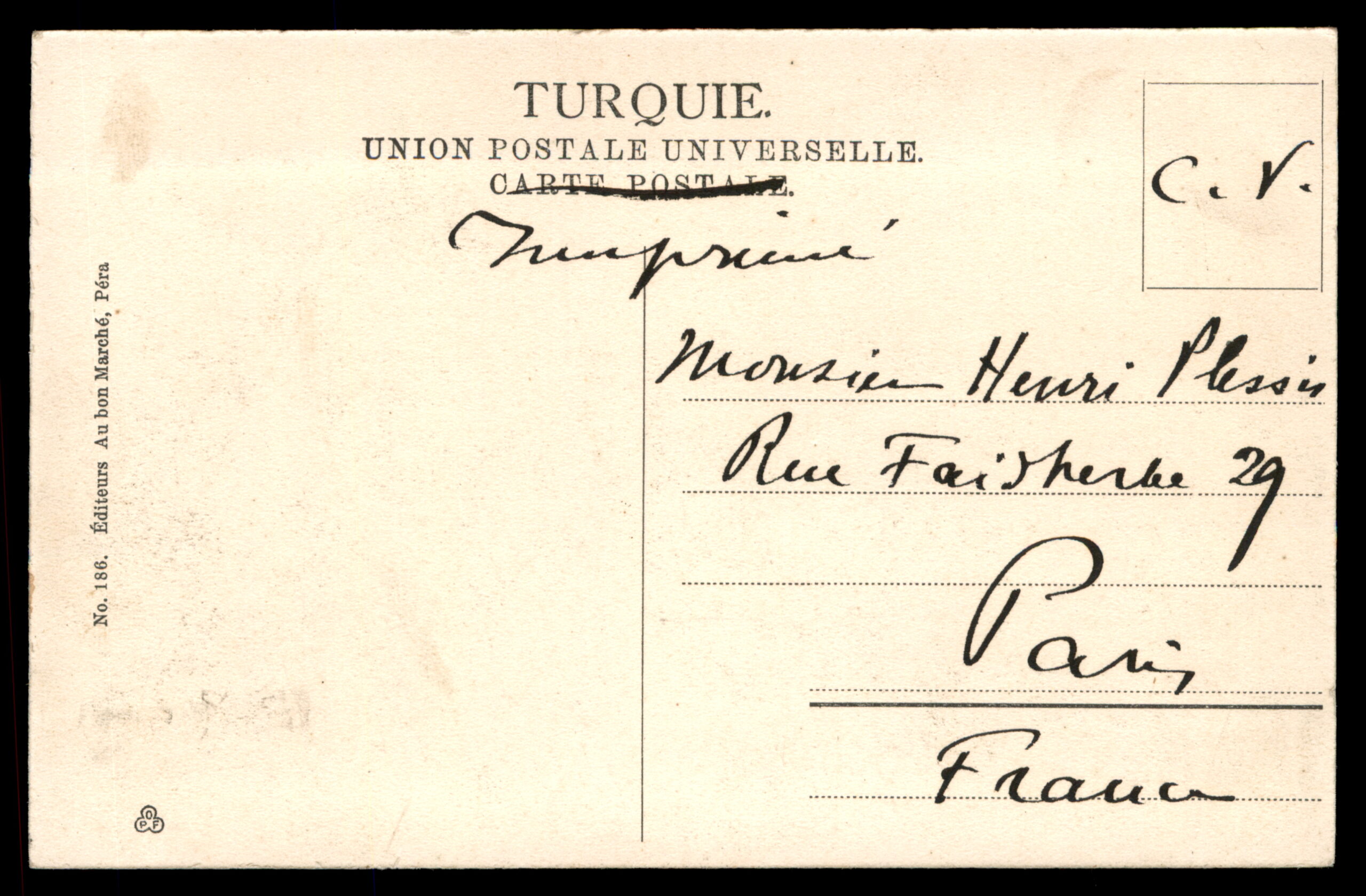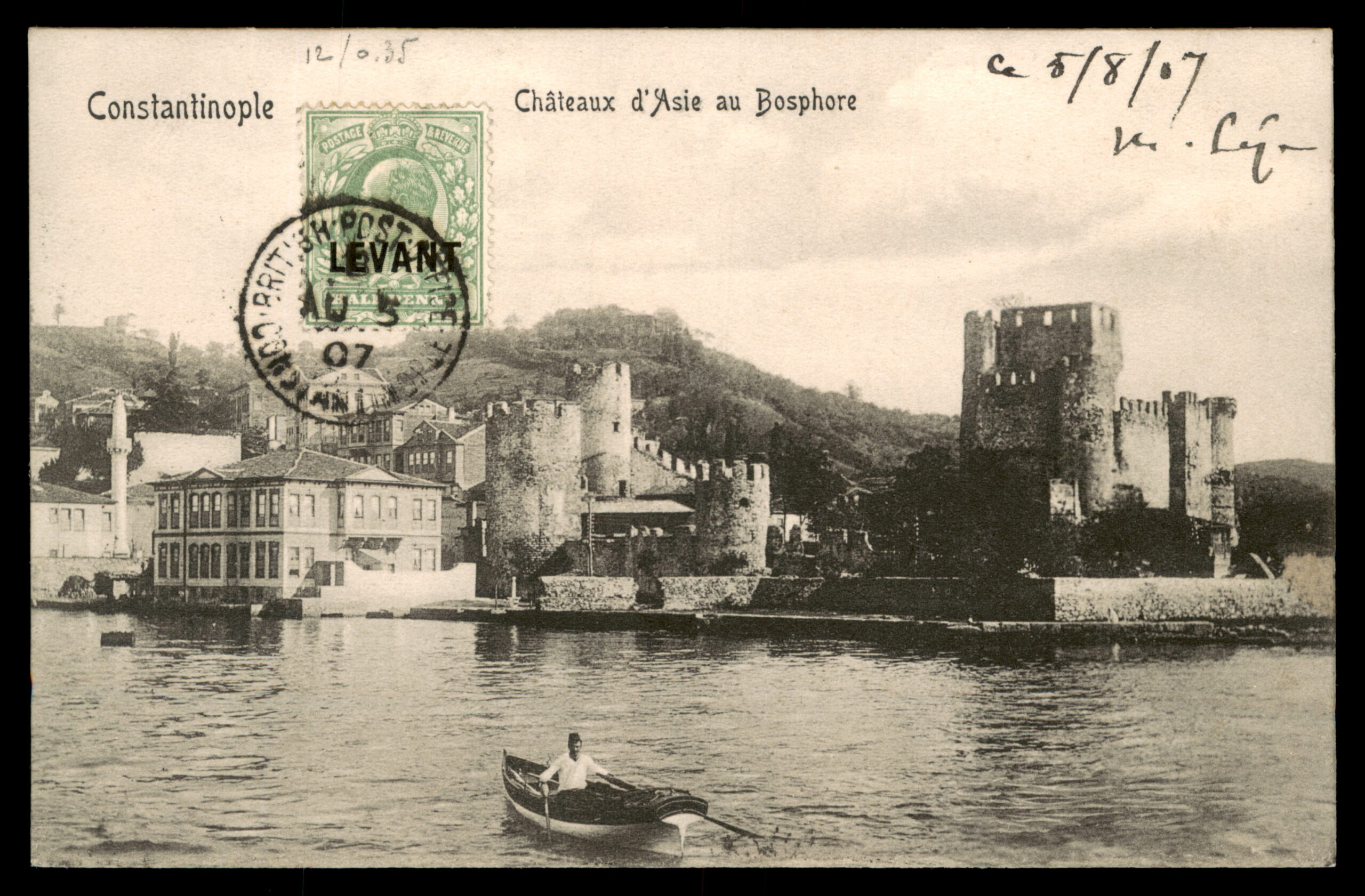 EN: Lot 208 – A postcard of Constantinople depicting the Châteaux d'Asie au Bosphore (Anadolu Hisarı – the Asian Fortress on the Bosphorus), showing the medieval fortress towers along the waterfront with a man rowing a boat. Franked with a British Post Office Levant stamp (King Edward VII), cancelled "BRITISH POST OFFICE LEVANT AU 5 07" (August 5, 1907). A scarce example of British Levant postal usage from Constantinople.