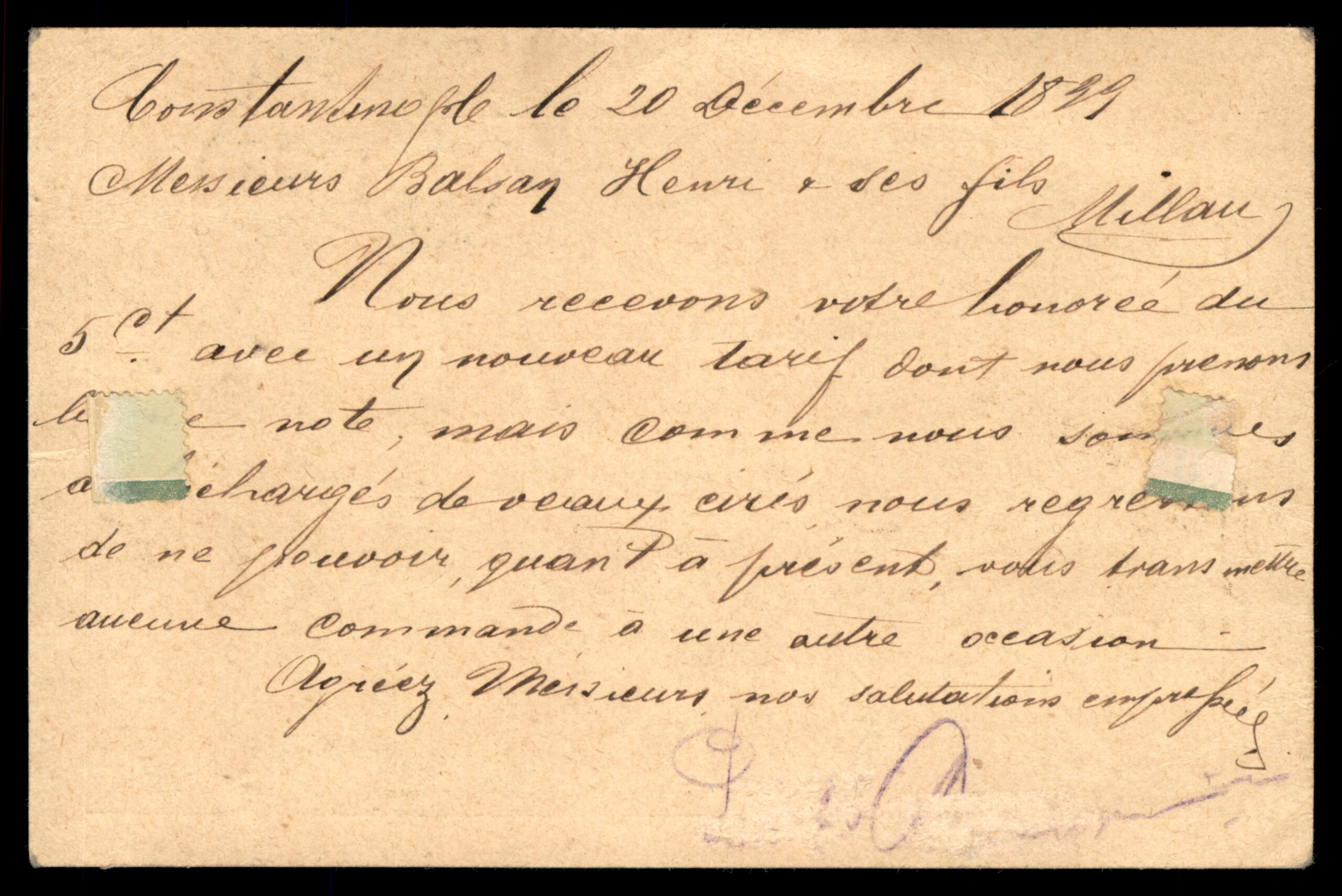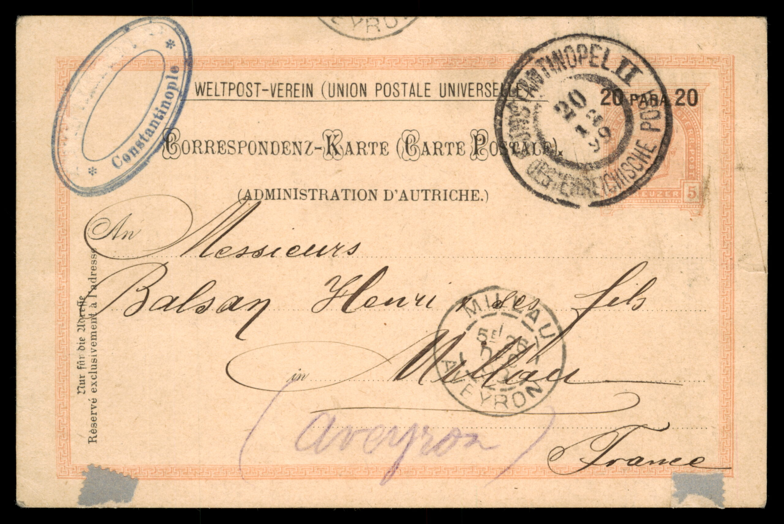 EN: Lot 211 – An Austrian Levant postal stationery card (Correspondenz-Karte, 20 Para, Administration d'Autriche) with oval "Constantinople" handstamp. Cancelled at "CONSTANTINOPEL II / OESTERREICHISCHE POST" (Austrian Post Office in Constantinople). Sent on 20 December 1899 to Messieurs Balsan Henri et ses fils, Millau, Aveyron, France. Millau arrival cancel. Commercial correspondence in French discussing new tariffs and calf leather (veaux cirés) trade. A fine example of Austrian Levant postal usage for international commerce.