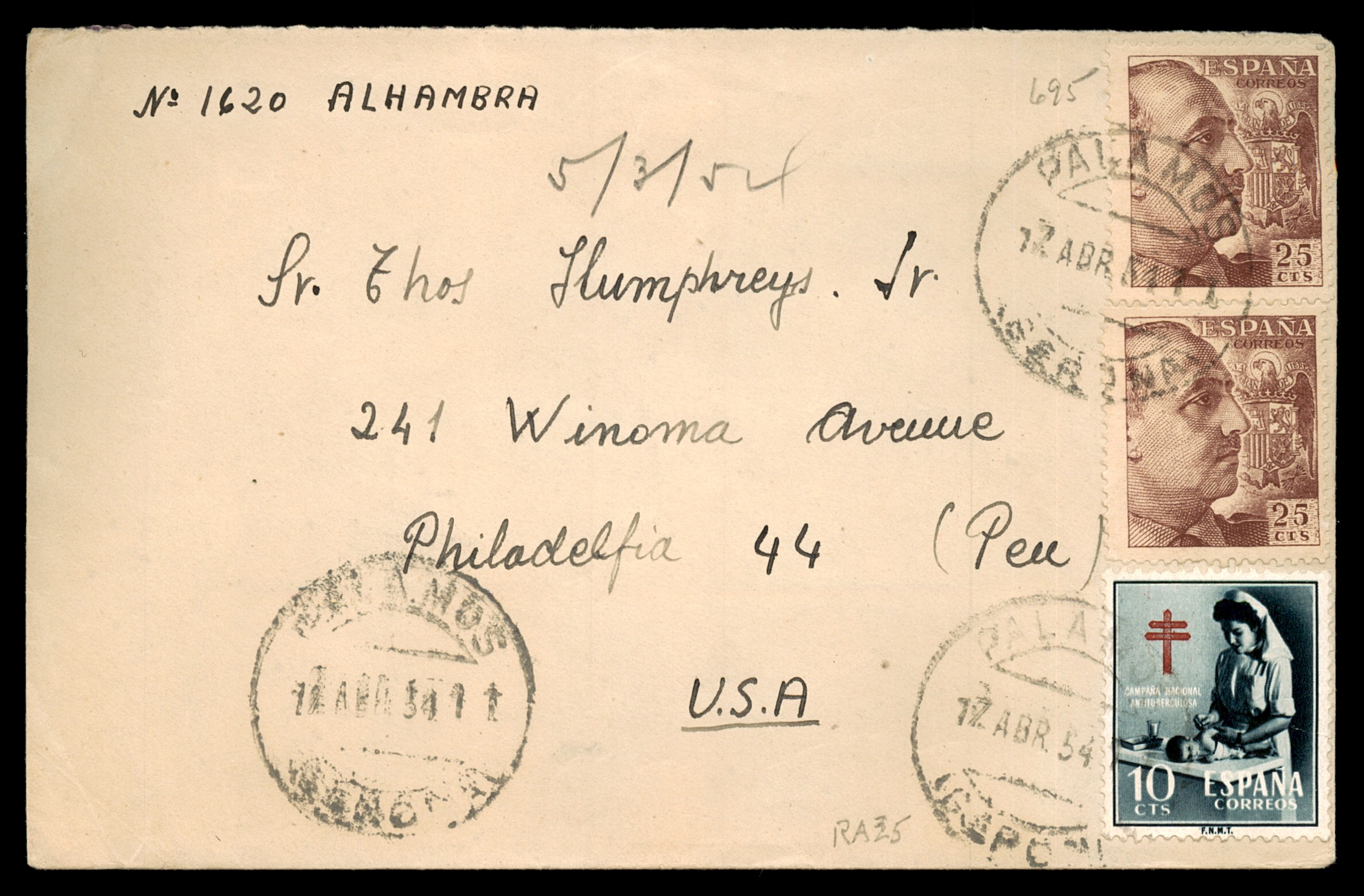 המכירותלוט 85 – מעטפה ספרדית "No. 1620 אלהמברה", פלמוס לפילדלפיה ארה"ב, 1954 | Lot 85 – Spain Cover "No. 1620 Alhambra" Palamos to Philadelphia USA 1954, with TB Charity Stamp