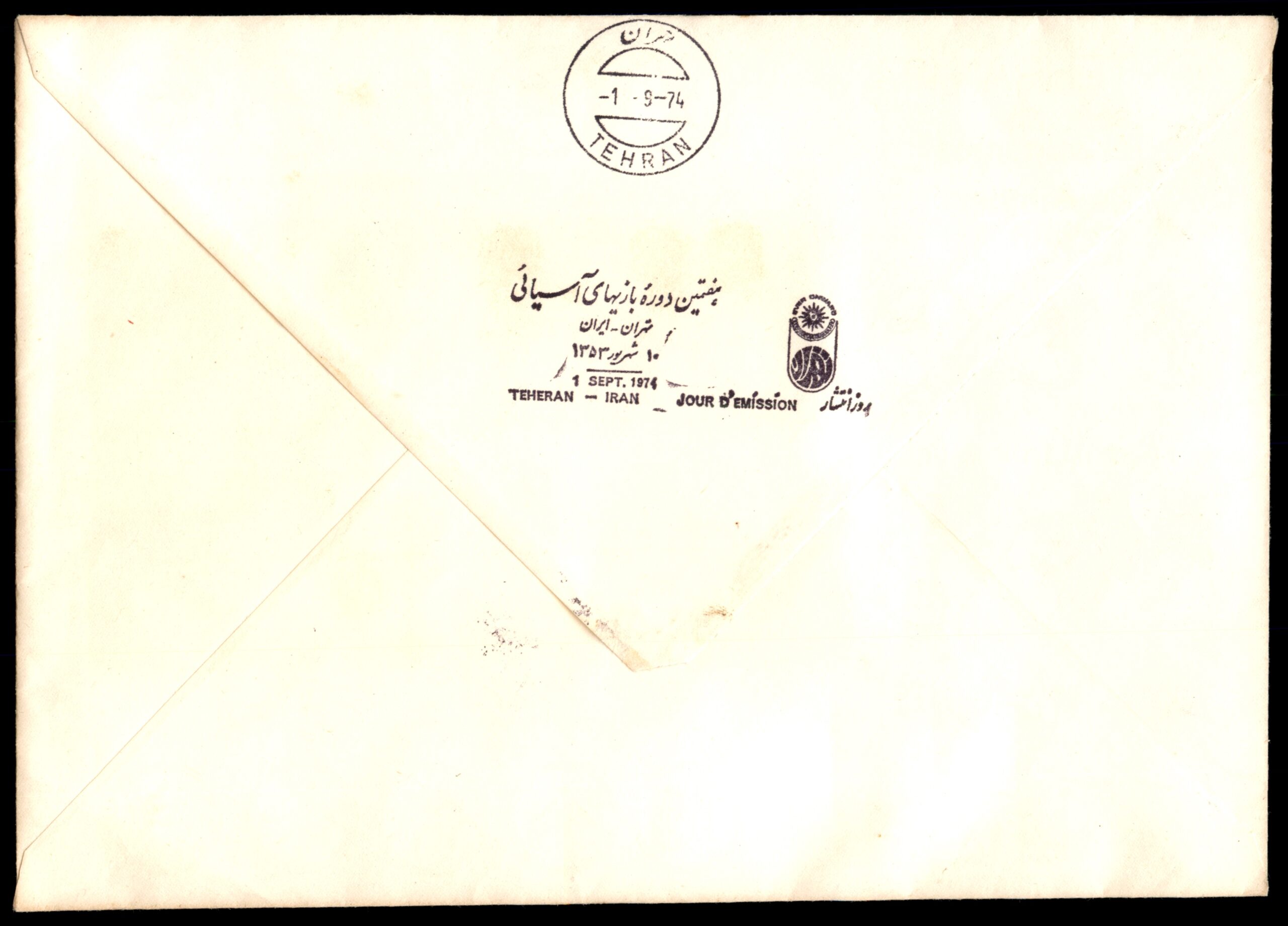 לוט 89 – מעטפת יום ראשון, איראן, משחקי אסיה השביעיים טהרן 1974 – שני גיליונות בולים | Lot 89 – Iran FDC: 7th Asian Games Tehran 1974 – Two Souvenir Sheets, September 1st First Day of Issue stamps iran Teheran