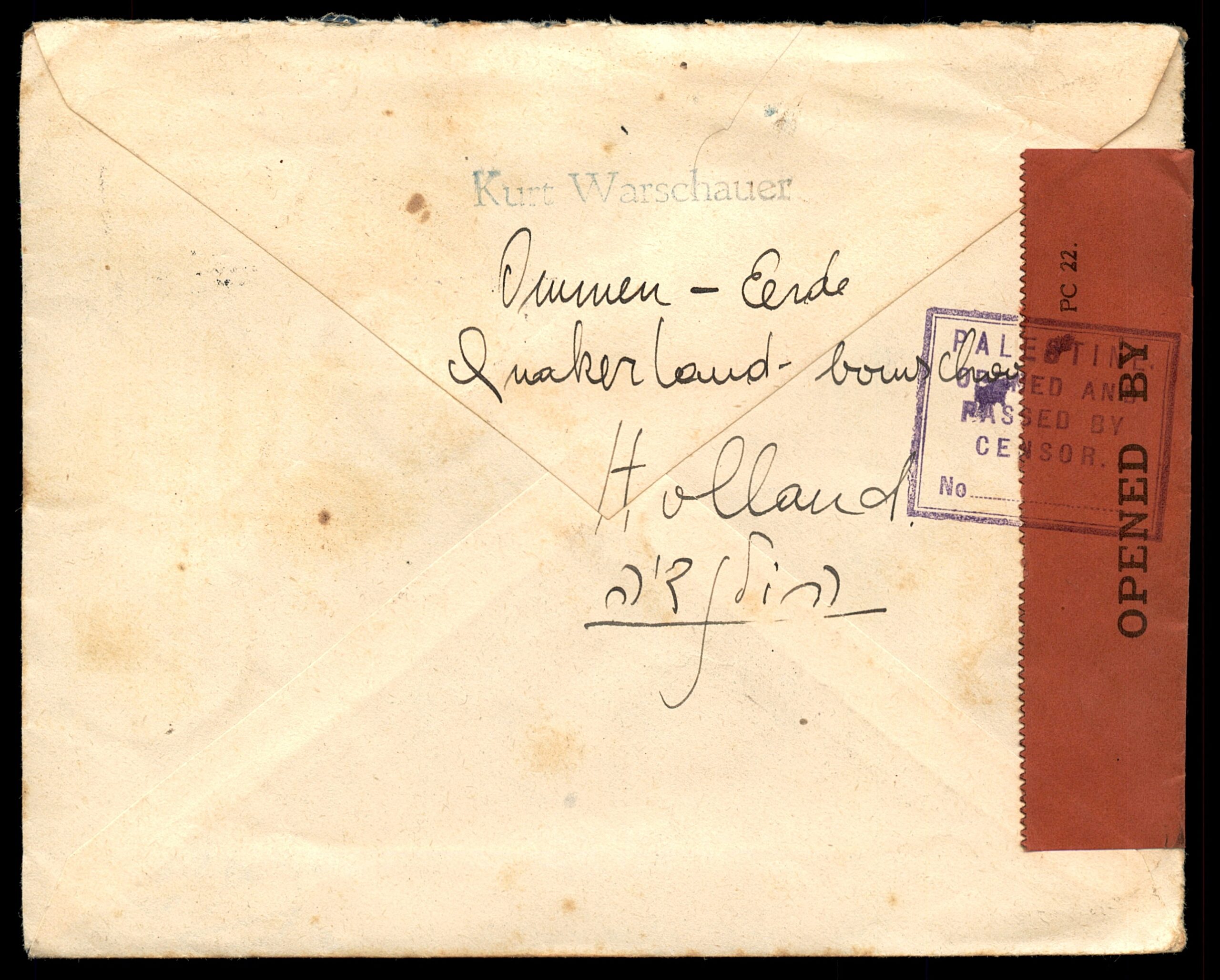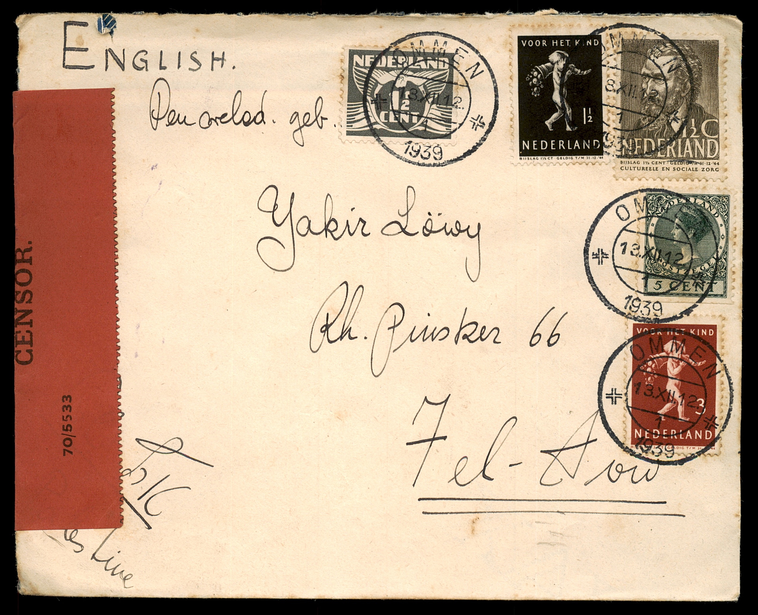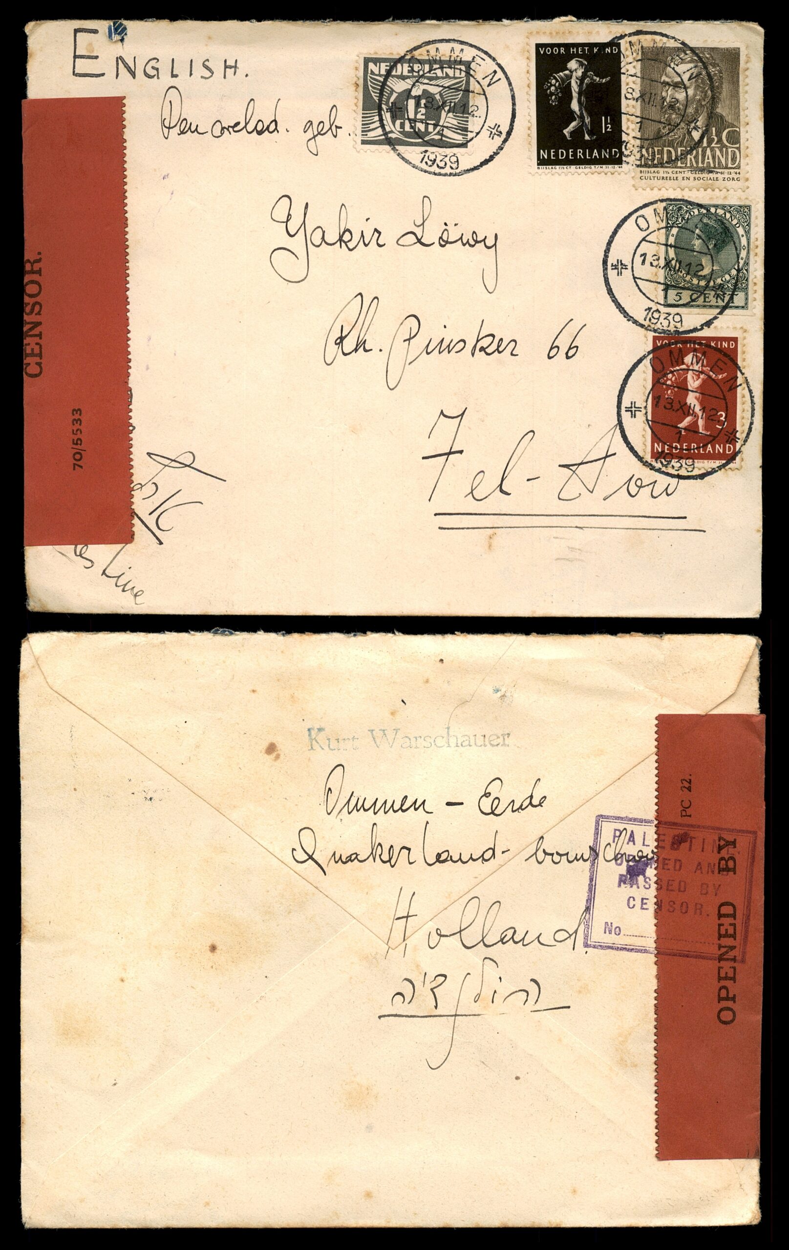HE: מעטפה צנזורה שנשלחה מאומן, הולנד אל תל-אביב, פלשתינה (א"י), חותמת דואר 13 בדצמבר 1939. ממוענת ליקיר לוי, רח' פינסקר 66, תל-אביב, כתובת שולח: ורשאואר, אומן-ארדה, קווייקרלנד, הולנד. משוחררת עם ארבעה בולי הולנד כולל הנפקות צדקה "Voor het Kind". על המעטפה סרט צנזורה של המנדט הבריטי בפלשתינה (מס' 70/5533) וחותמת "OPENED BY CENSOR". פריט בעל חשיבות היסטורית המקשר בין קהילת הפליטים היהודים במחנה הקווייקרים באומן-ארדה לבין היישוב בפלשתינה ערב מלחמת העולם השנייה. מצב טוב.