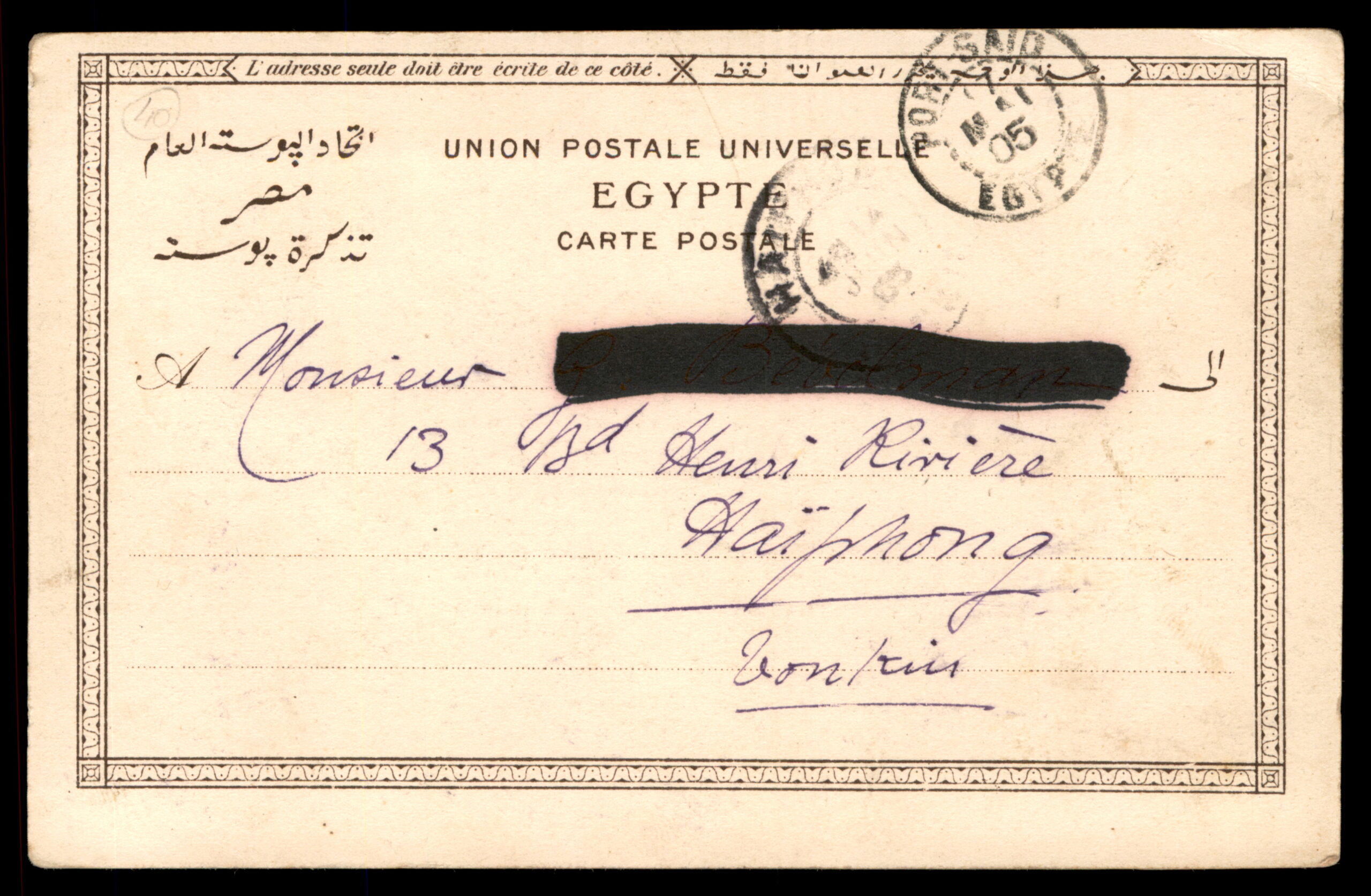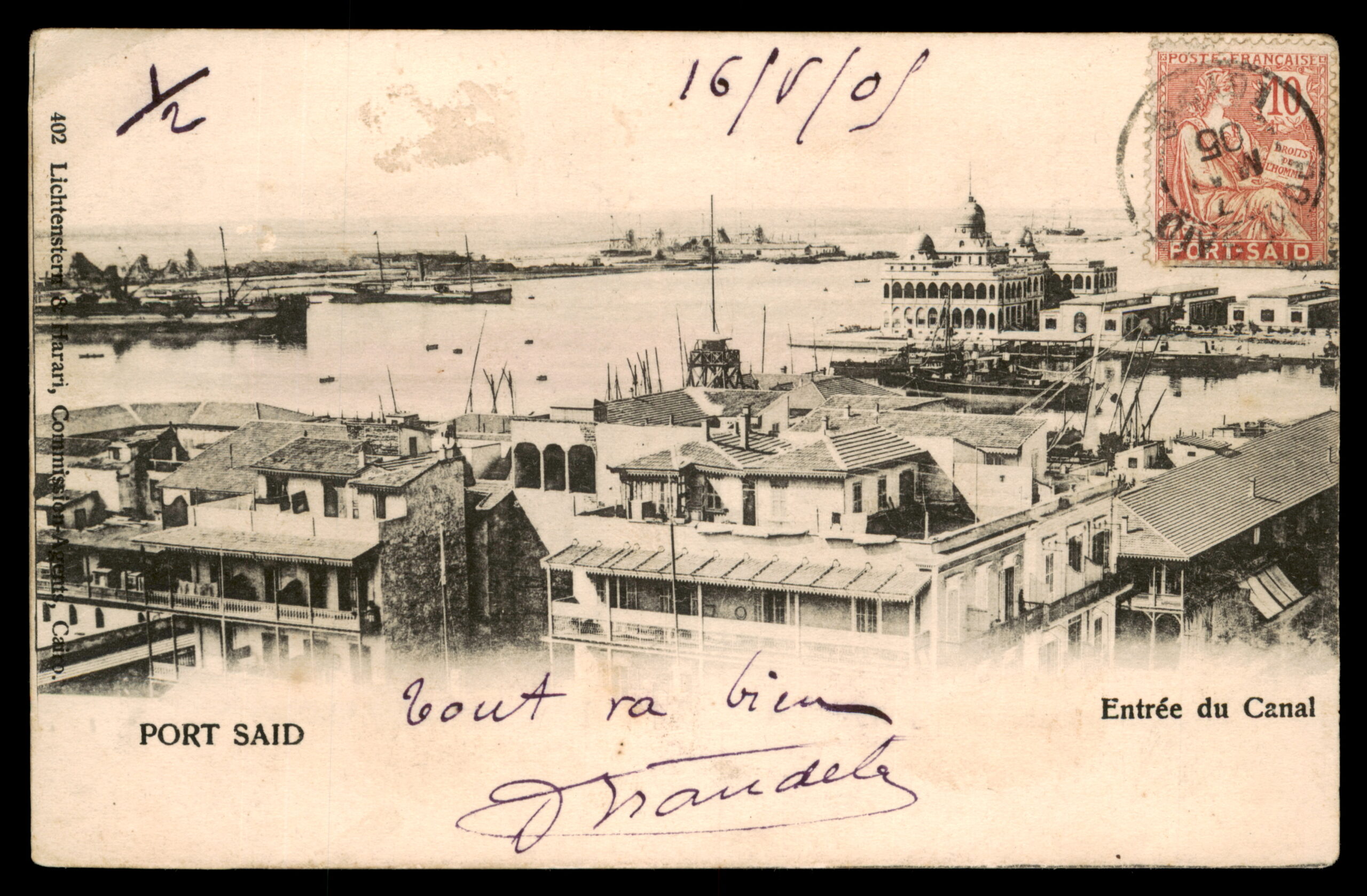 EN: Lot 176 – Vintage postcard of Port Said showing the entrance to the Suez Canal, with a panoramic view of the harbor, ships, and colonial-era buildings. Published by Lichtenstern & Harari, Cairo, No. 402. Franked with a 10c French Post Office in Port-Said stamp (Postes Françaises, Port-Saïd overprint), postmarked May 16, 1905. Addressed to Monsieur at 13 Boulevard Henri Rivière, Haïphong, Tonkin (French Indochina – modern-day Vietnam). An exceptional postal history item connecting Egypt, France, and Indochina through the colonial postal network.