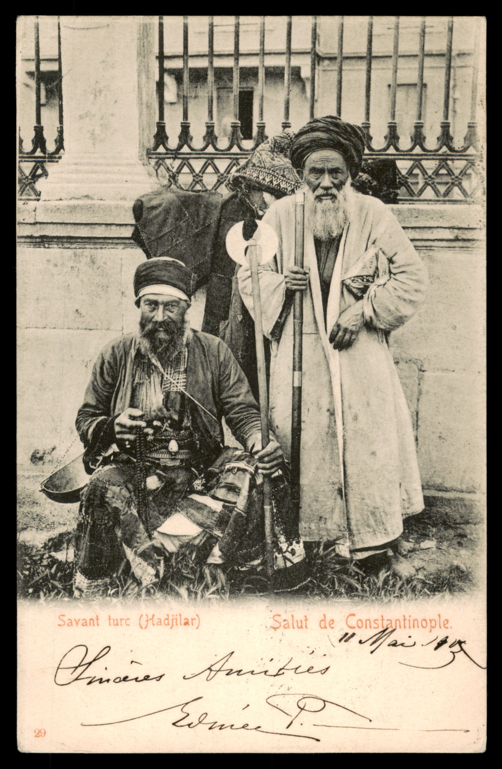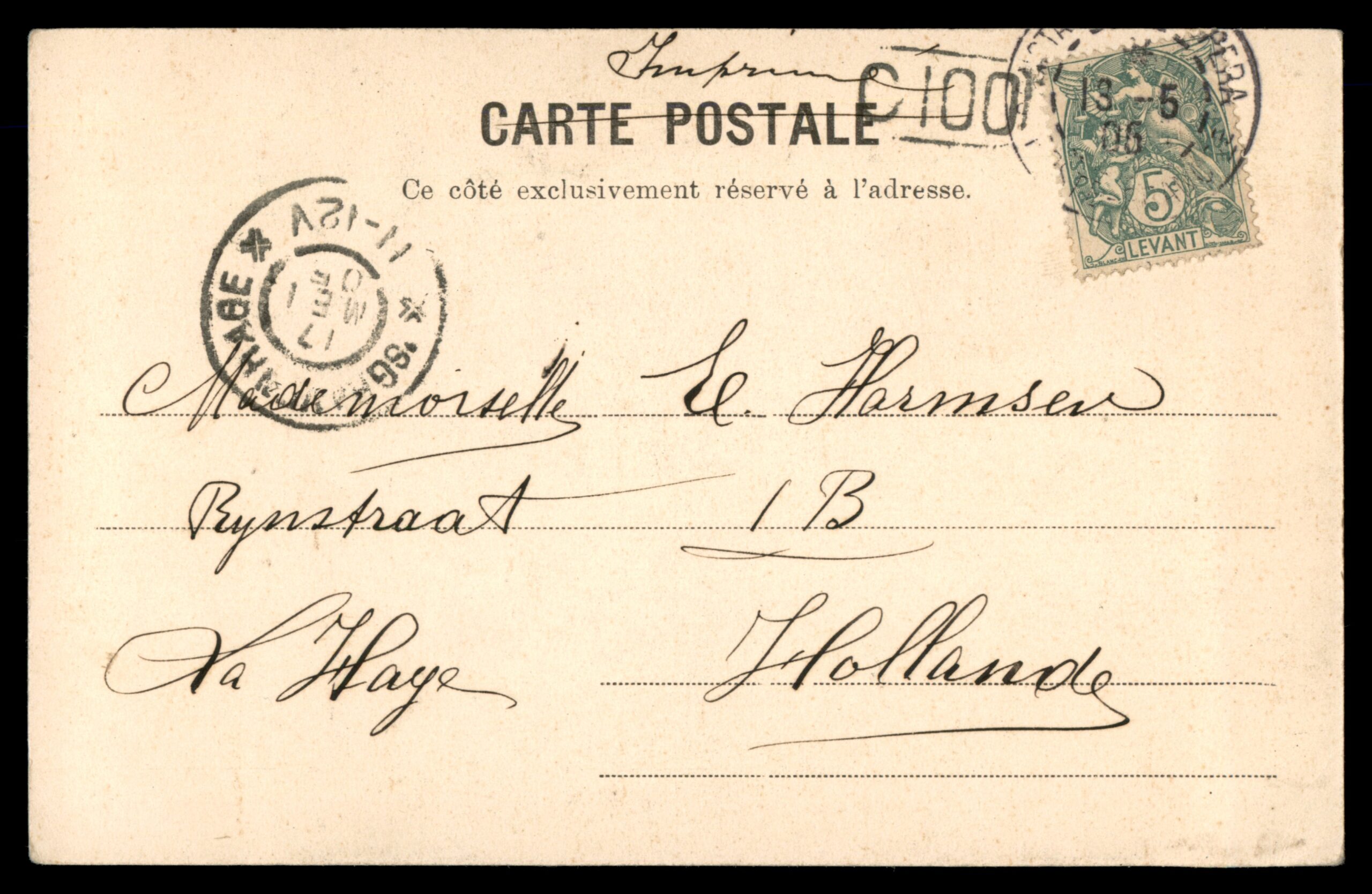 EN: Lot 180 – Vintage Ottoman postcard titled "Savant turc (Hadjilar) – Salut de Constantinople," depicting two Turkish scholars or Hajj pilgrims (Hadjilar) in traditional attire, one seated and one standing, in front of an ornate iron railing. Dated May 11, 1903. Franked with a 5 centimes French Levant stamp, cancelled at the French Post Office in Constantinople (13 May 1906). Addressed to Mademoiselle E. Harmsen, Rynstraat 1B, La Haye (The Hague), Holland. With arrival postmark from The Hague. A captivating ethnographic postcard showcasing Ottoman-era figures with French Levant postal history.
