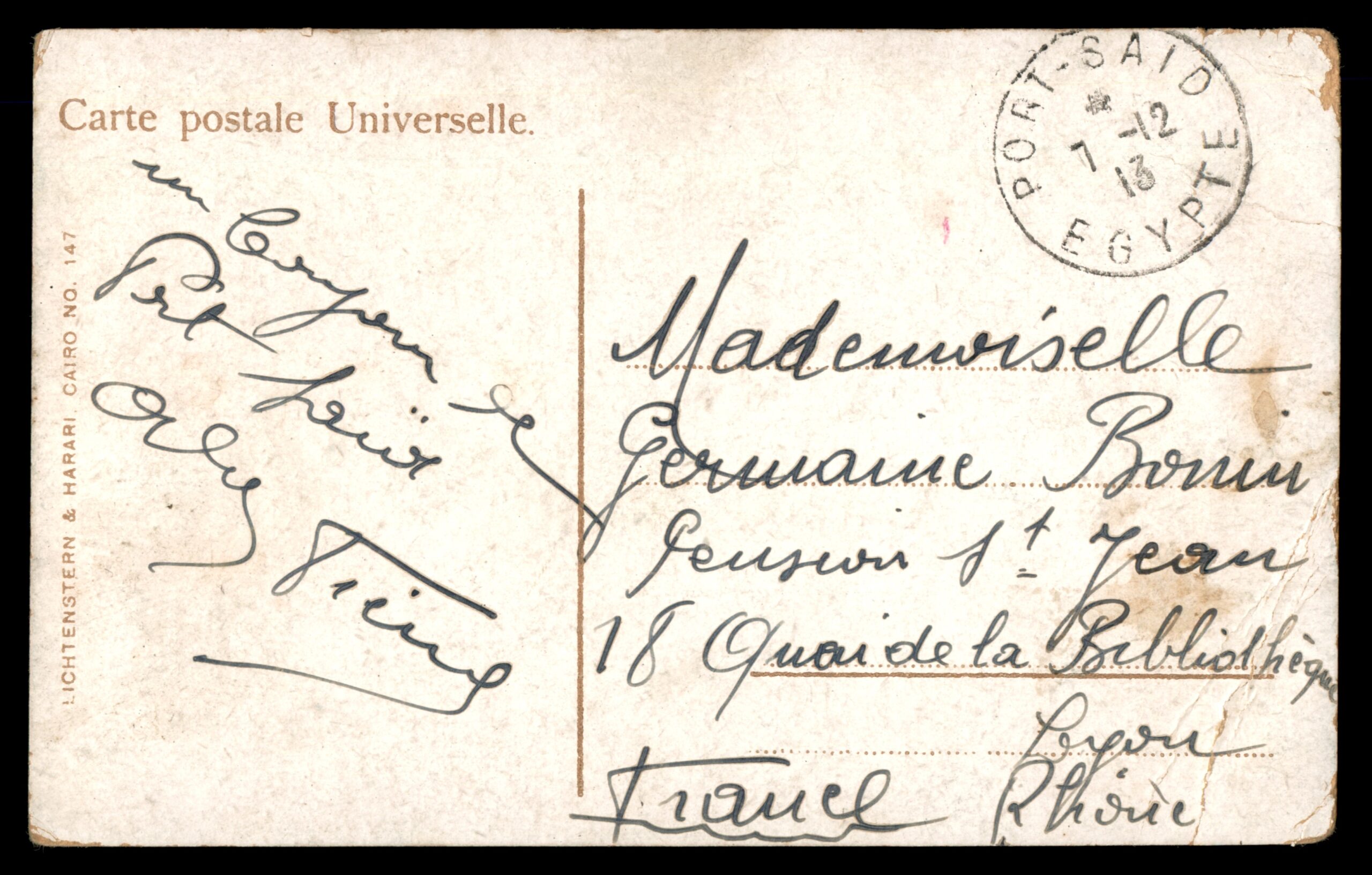 EN: Lot 191 – Vintage Egyptian postcard titled "Fellahine portant de l'eau" (Fellaheen Women Carrying Water), depicting two Egyptian peasant women in traditional dress carrying water jugs on their heads, with a small child sitting at their feet. Published by Lichtenstern & Harari, Cairo, No. 147. Franked with French Post Office in Port-Said stamps (5 centimes pair), cancelled at "PORT-SAID / EGYPTE" (December 7, 1913). Addressed to Mademoiselle Germaine Bonin, Pension St. Jean, 18 Quai de la Bibliothèque, Lyon, Rhône, France. A classic ethnographic scene of Egyptian rural life with French postal history from Port Said.