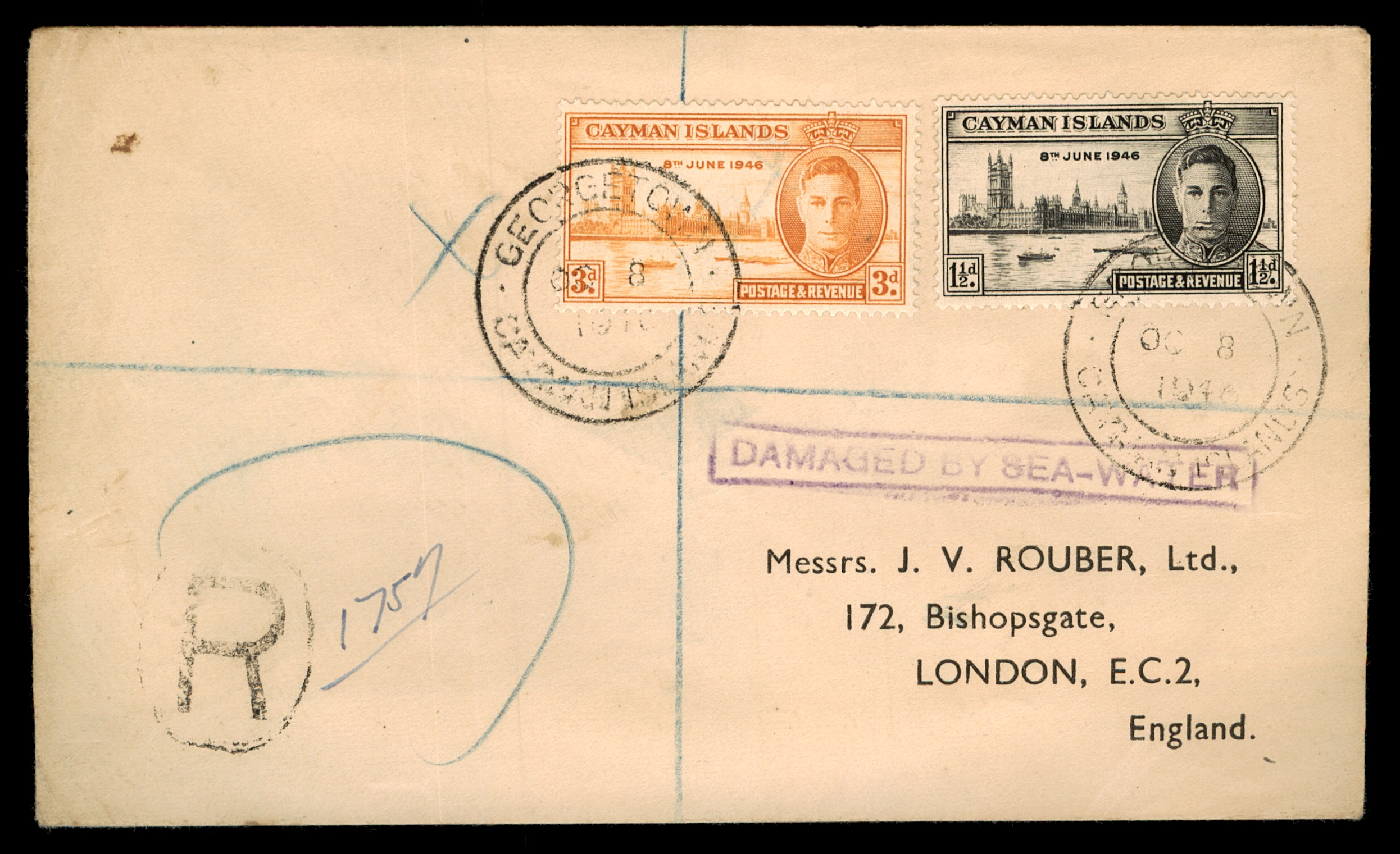 EN: Fascinating Cayman Islands registered cover (R 1757), dated 8 June 1946 (Victory Issue day), franked with two King George VI stamps (3d orange and 1½d black), postmarked Georgetown, Cayman Islands. Addressed to Messrs. J.V. Rouber Ltd., 172 Bishopsgate, London E.C.2. Bears the remarkable cachet "DAMAGED BY SEA-WATER" in purple. A rare piece of philatelic history with extraordinary provenance.