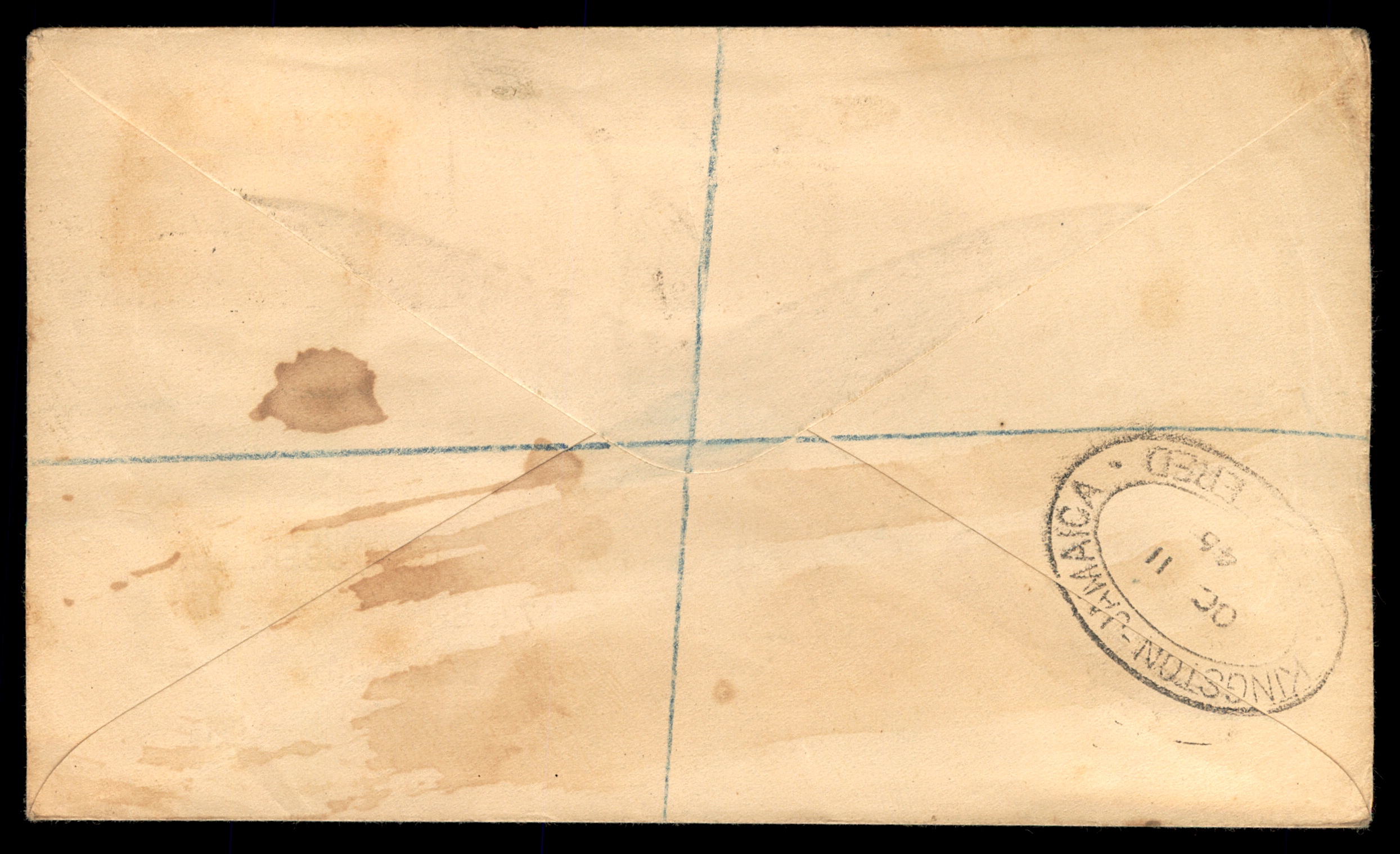 עב: מעטפה רשומה מרתקת מאיי קיימן (R 1757), מתאריך 8 יוני 1946 (יום הנפקת בולי הניצחון), עם שני בולי מלך ג'ורג' השישי (3d כתום ו-1½d שחור), חותמת ג'ורג'טאון, איי קיימן. ממוענת לחב' J.V. Rouber, 172 Bishopsgate, לונדון E.C.2. עם חותמת יוצאת דופן "DAMAGED BY SEA-WATER". פריט בולאי נדיר עם היסטוריה יוצאת דופן.