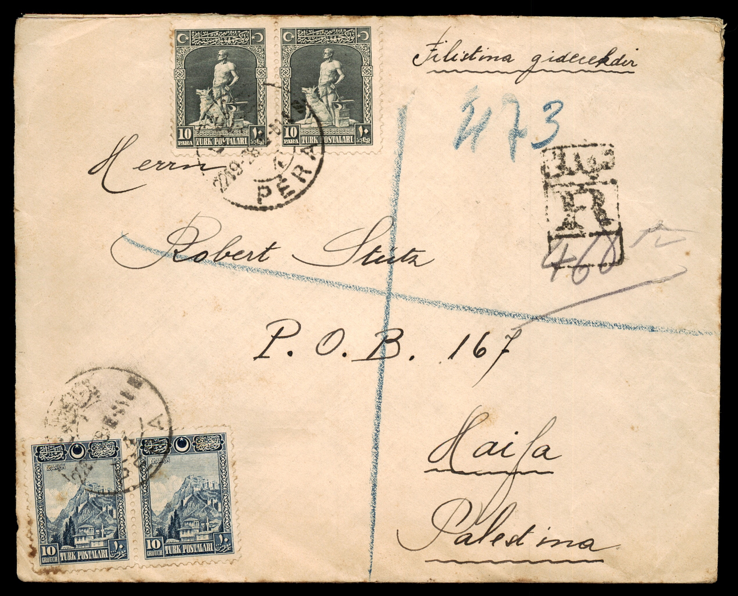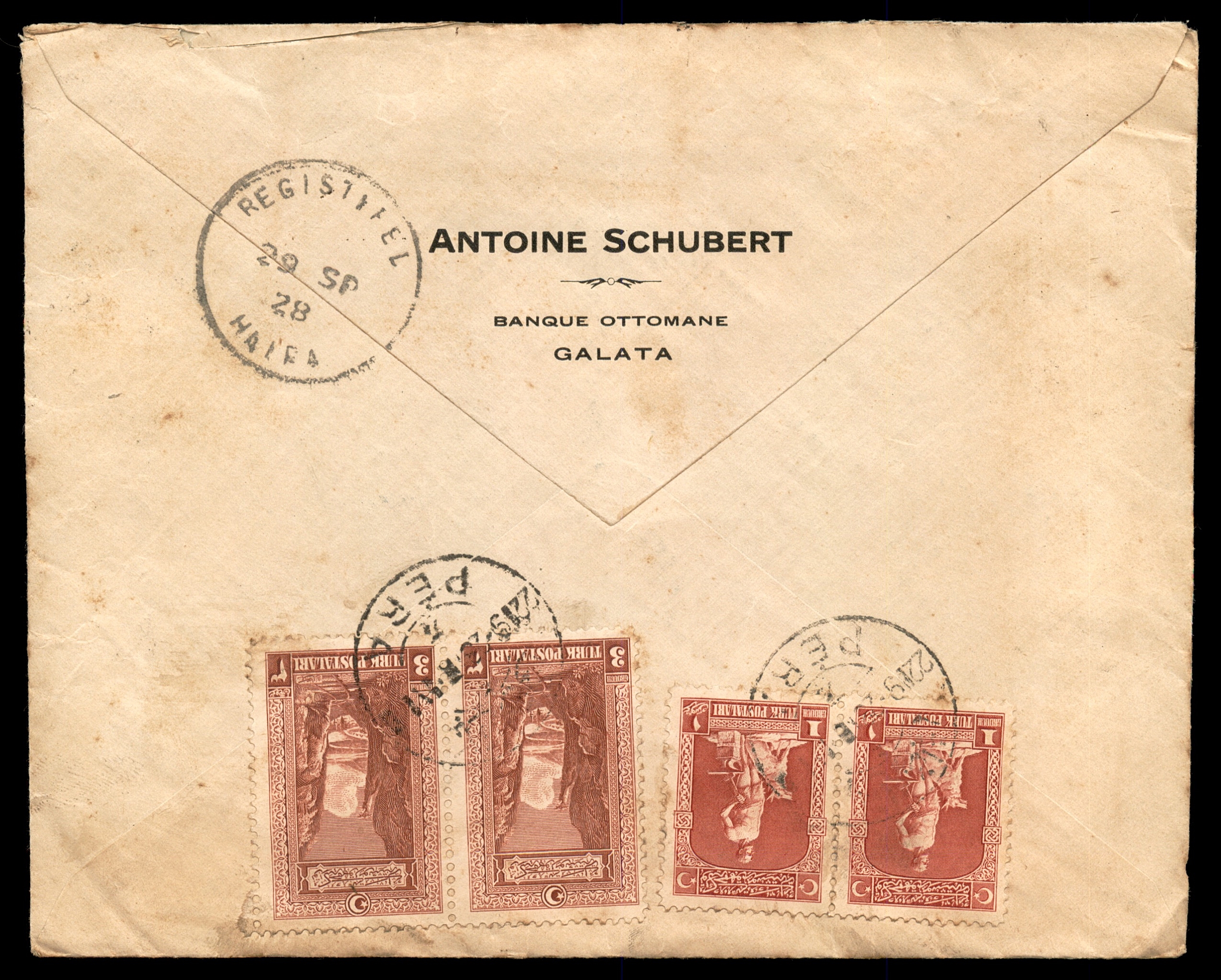עב: מכתב רשום נדיר מ-Antoine Schubert, Banque Ottomane (הבנק העות'מאני), גלטה, איסטנבול, לרוברט סוטה, ת.ד. 167, חיפה, פלשתינה (1929). על הצד הקדמי: בולי "Türk Postalar" (עם רוכב ומסגד), חותמת "Filistina gidecekdir" בטורקית עות'מאנית, ומספר רשום 473 מדואר פרה. על הגב: בולים טורקיים נוספים וחותמת דואר פרה מ-29 ספטמבר 1929. פריט דואר יוצא דופן לקולקציית יודאיקה/פלשתינה.