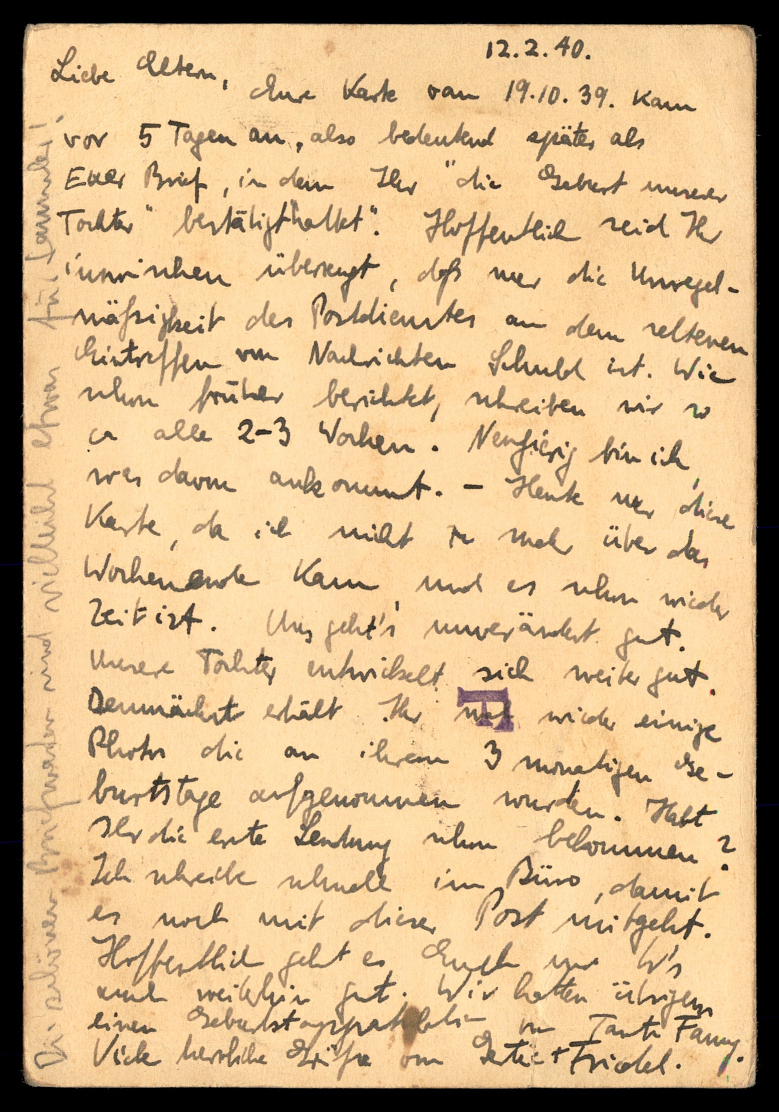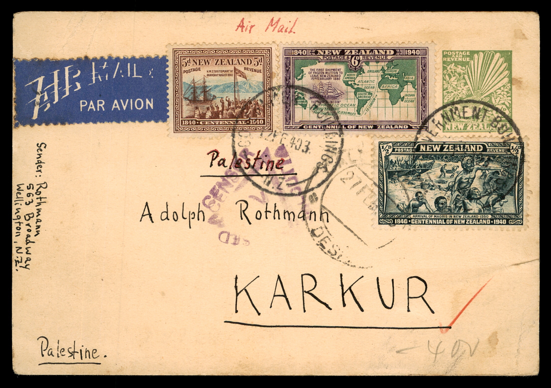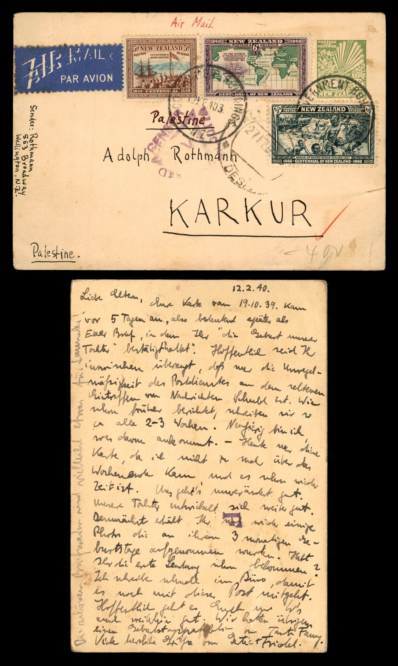 עב: מכתב דואר אוויר מניו זילנד לפלשתינה בתקופת מלחמת העולם השנייה (1940). ממוען לאדולף רוטמן, כרכור, פלשתינה. עם בולים לרגל מאה שנות ניו זילנד (1940) כולל עיצובי ספינה ומפת עולם. תווית "By Air Mail / Par Avion", חותמת "Palestine". גב: מכתב בכתב יד בגרמנית מ-12.2.40. פריט דואר היסטורי חשוב הקשור ליהדות ולפלשתינה.