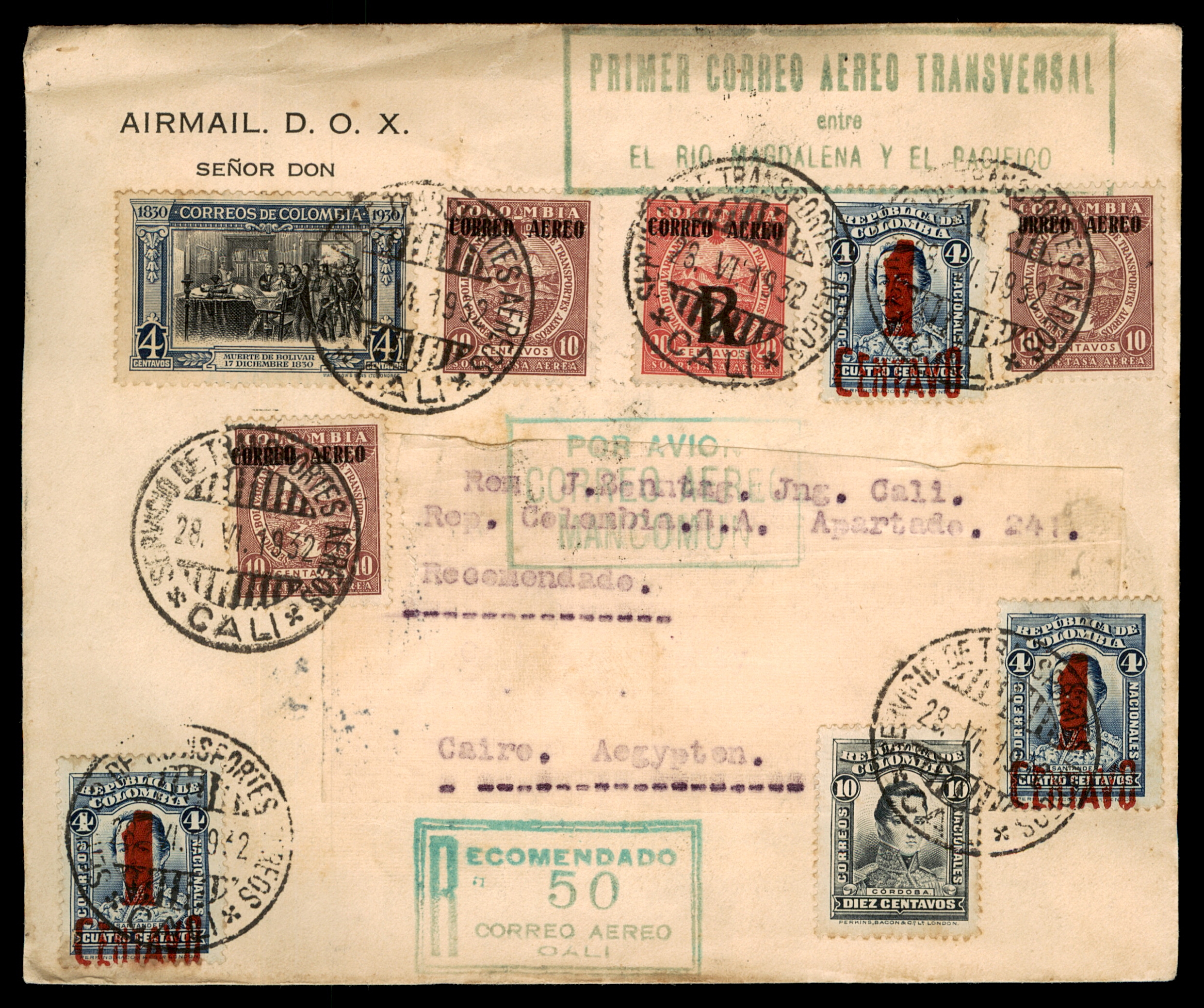 EN: Rare historic Colombia "Primer Correo Aero Transversal" (First Transversal Airmail between the Magdalena River and the Pacific) cover via the D.O.X. flying boat service, c.1932. Sent registered (Recomendado 50) from Cali, Colombia, ultimately addressed to Cairo, Egypt (via New York and Miami). Franked with multiple Colombia airmail stamps with "CALI" overprints. Back shows transit cancels: Alexandria (20 Jul 32), New York, Miami. Sender: Karl Hennig, Mackenthors, Hamburg. Exceptional philatelic rarity.