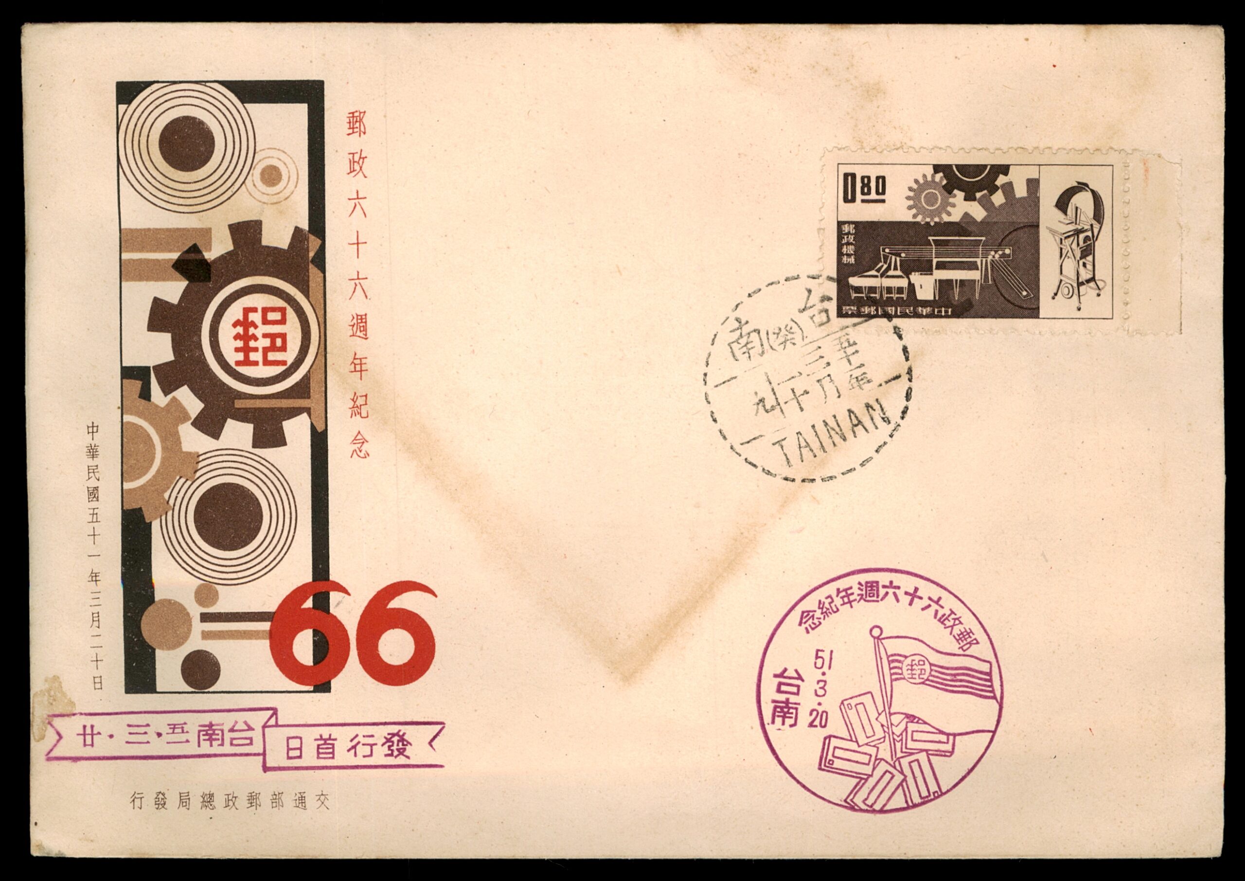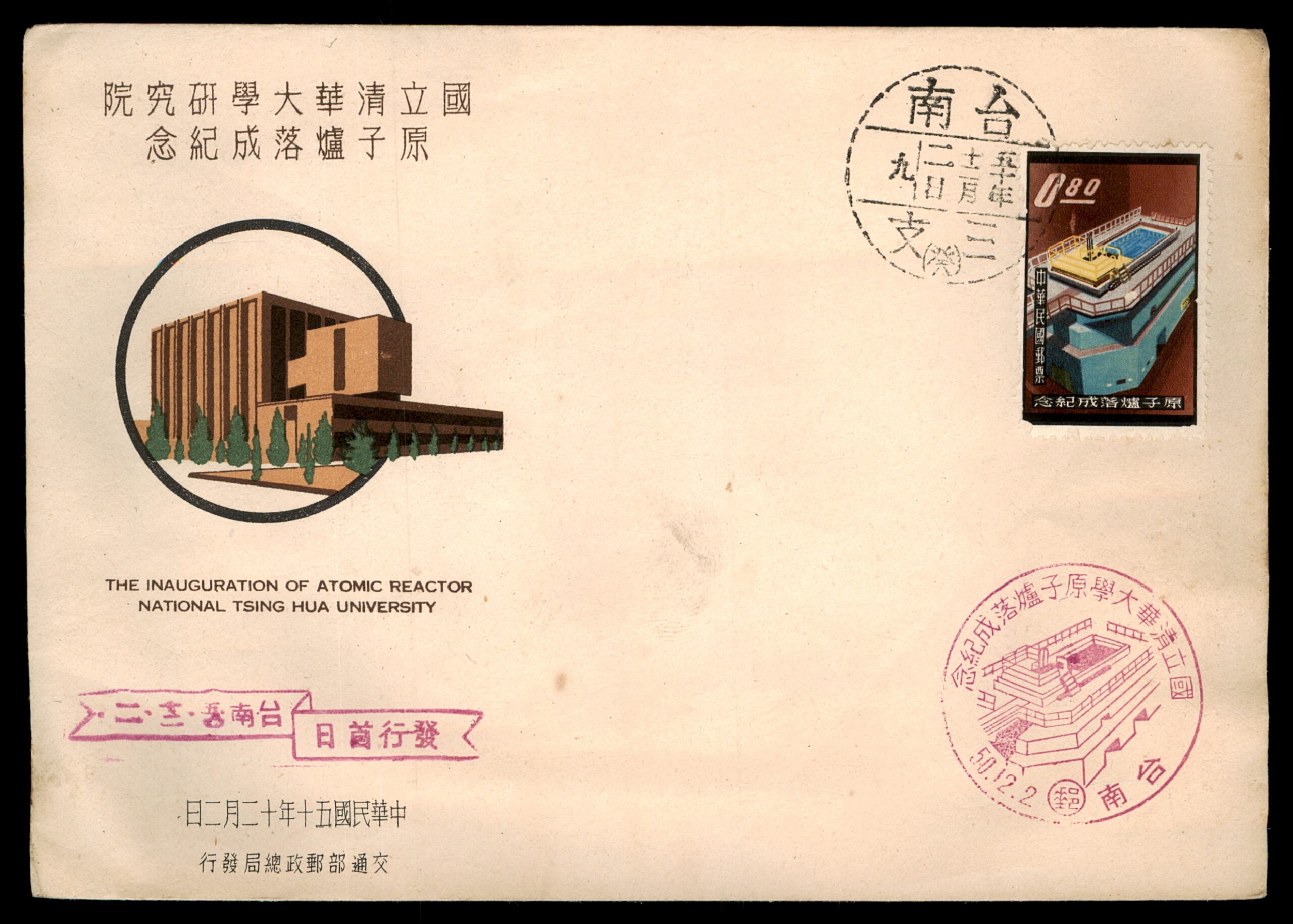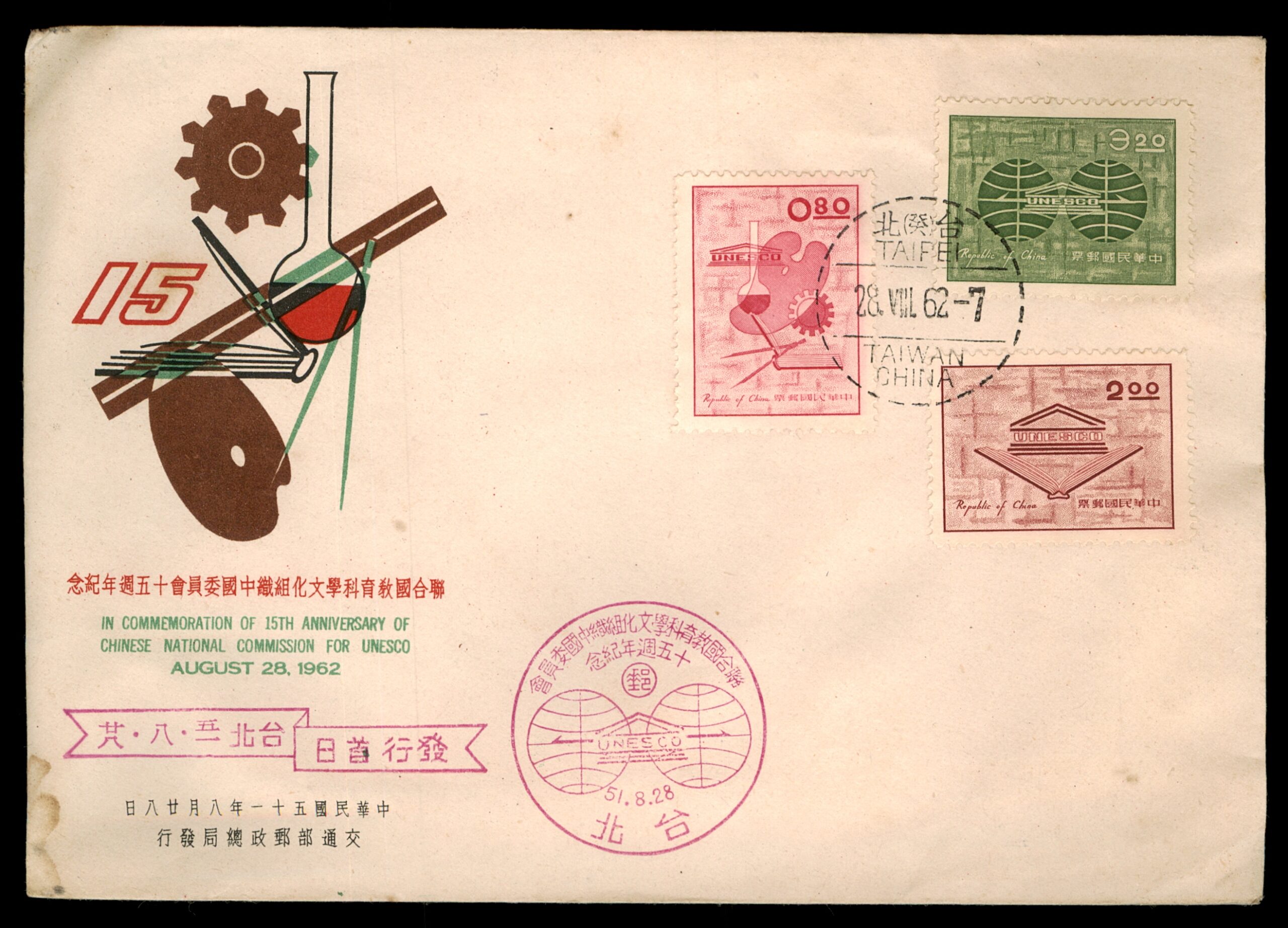EN: Lot of 4 Republic of China (Taiwan/Formosa) First Day Covers (FDCs), c. 1958–1962: (1) 15th Anniversary of Chinese National Commission for UNESCO, Taipei 1962; (2) 66th Anniversary commemorative, Tainan postmark; (3) Inauguration of Atomic Reactor, National Tsing Hua University FDC; (4) UNESCO Building, Paris cover with 4 stamps including Eiffel Tower and UNESCO HQ designs. All with special commemorative cachets. Attractive Taiwan philatelic material.