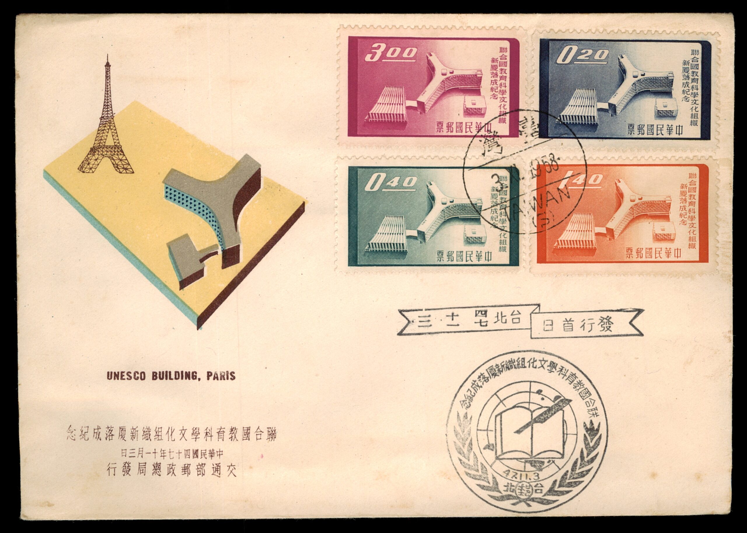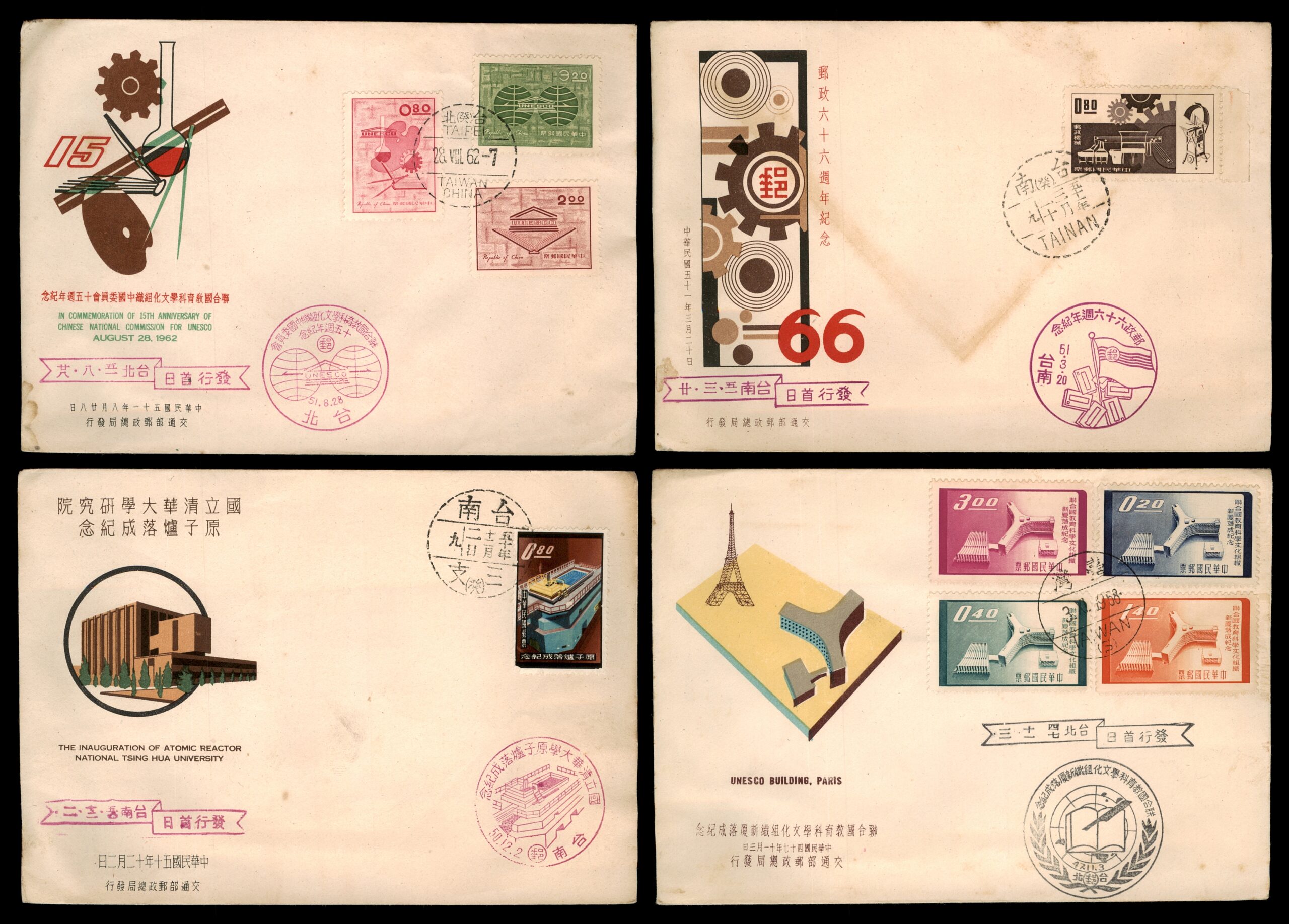 עב: לוט של 4 מעטפות יום ראשון (FDC) מרפובליקת סין (טייוואן/פורמוזה), כ-1958–1962: (1) 15 שנה לנציבות הלאומית הסינית ל-UNESCO, טייפיי 1962; (2) ציון יובל 66, חותמת טייגנן; (3) חנוכת הכור האטומי, אוניברסיטת קינג-הואה הלאומית; (4) בניין UNESCO בפריז עם 4 בולים כולל מגדל אייפל. כל המעטפות עם חותמות זכרון מיוחדות. חומר בולאי טייוואני אטרקטיבי.