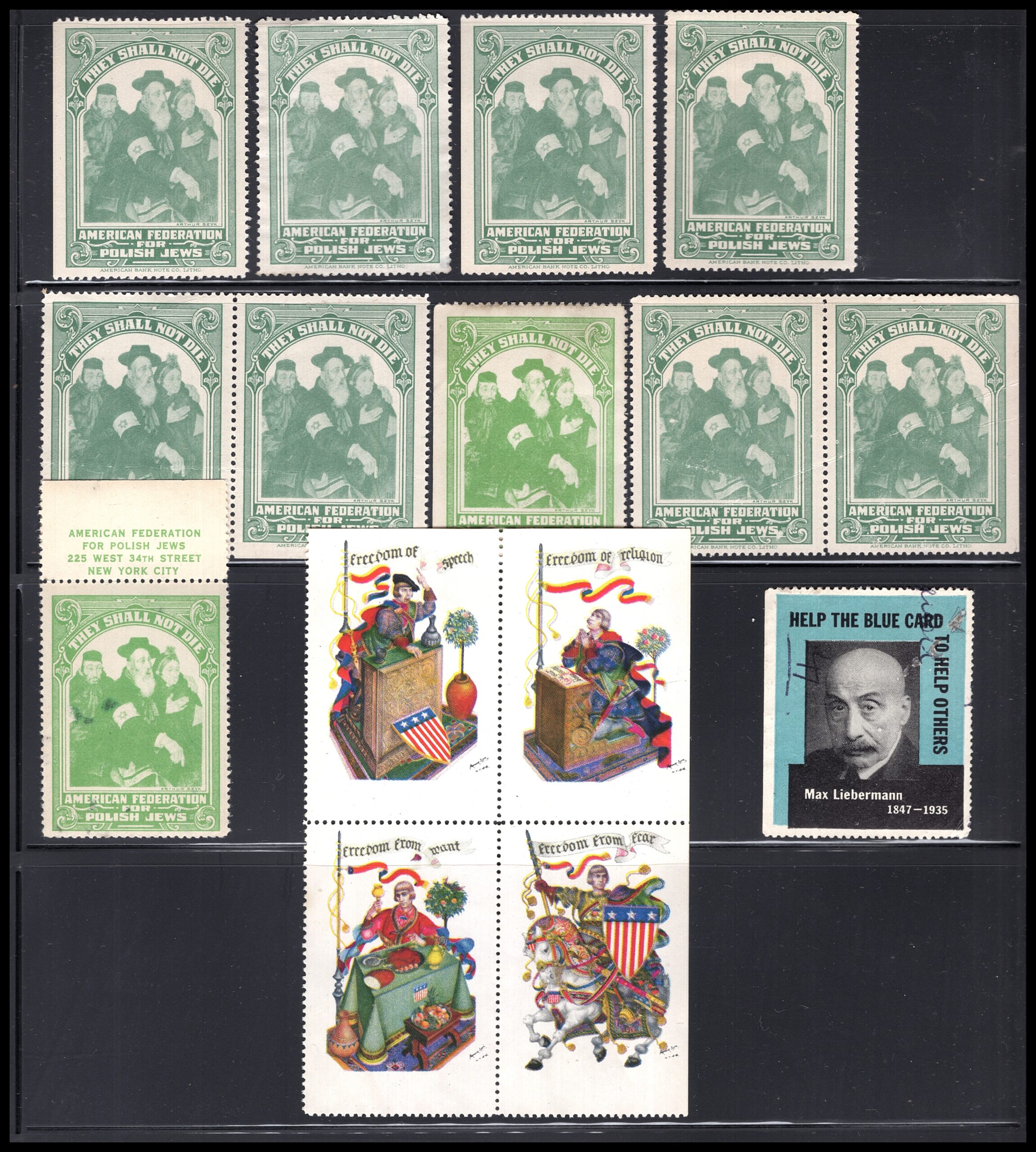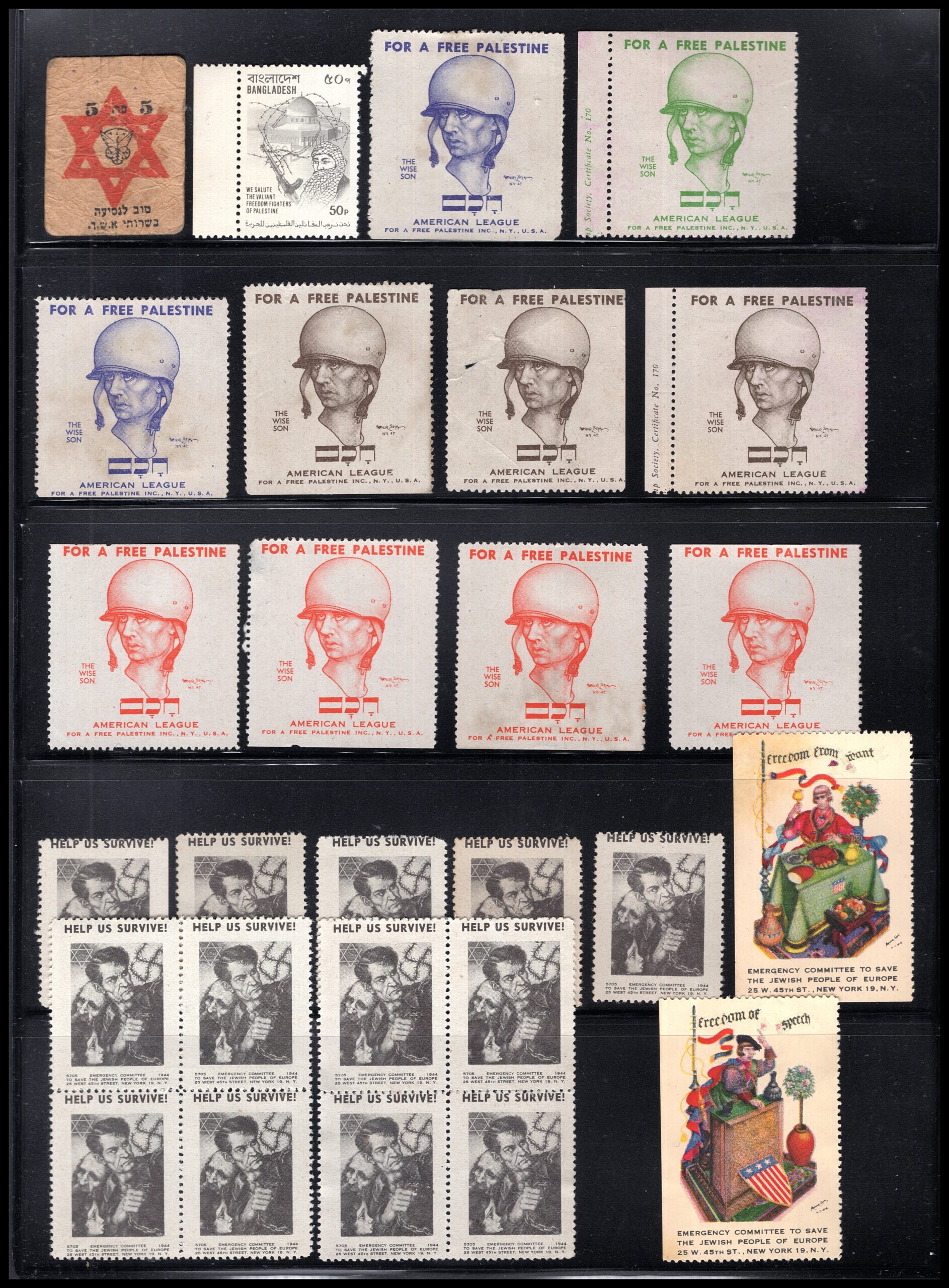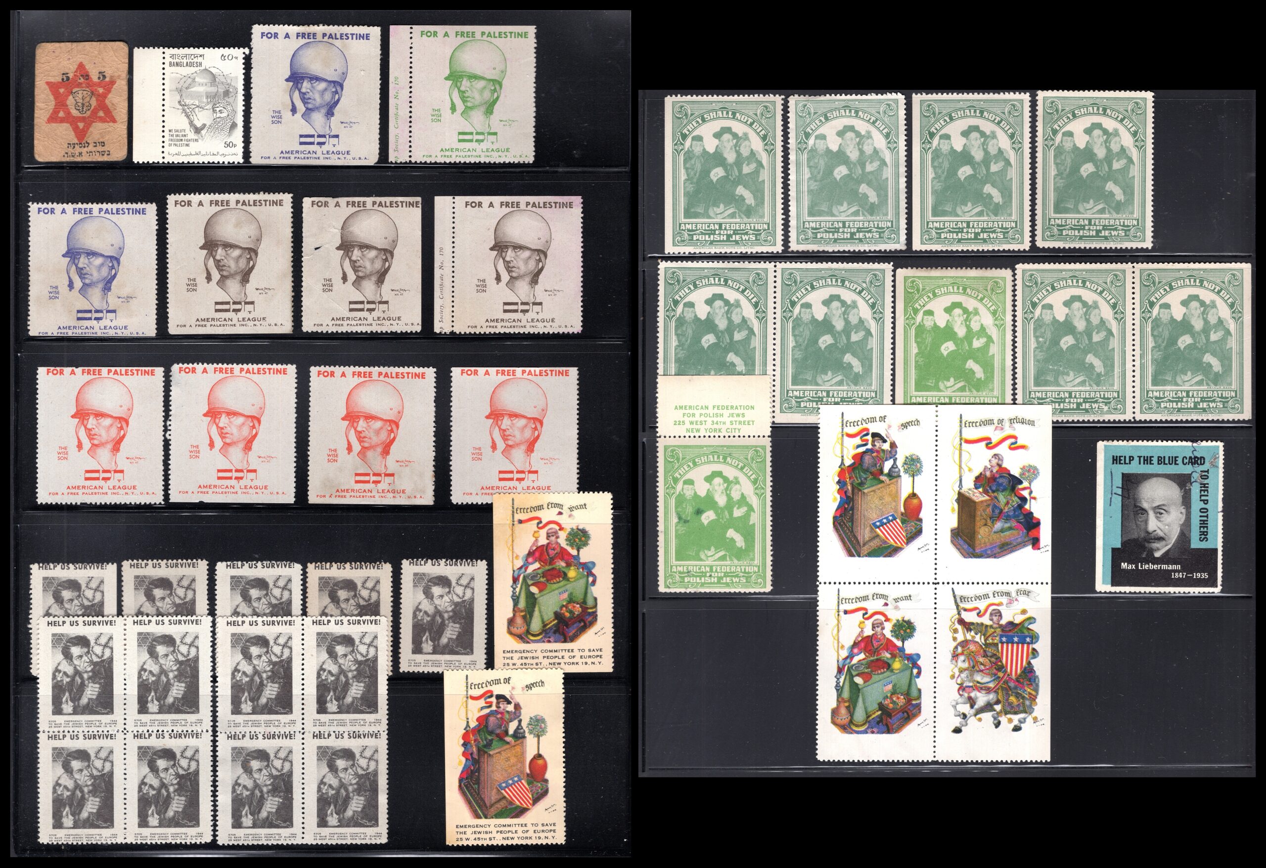 EN: Fascinating collection of Zionist/Jewish cinderella stamps, labels and charity seals, c.1940s-1950s, mounted on stockpages: (1) "FOR A FREE PALESTINE" American League labels in blue (3) and red (4) – soldier in helmet; (2) "HELP US SURVIVE!" black/gray stamps x10 blocks – Emergency Committee to Save the Jewish People of Europe; (3) "THEY SHALL NOT DIE" green stamps x9 – American Federation for Polish Jews; (4) "Freedom from Speech / Freedom of Religion" WWII American liberty labels x4; (5) "HELP THE BLUE CARD to Help Others – Max Liebermann 1847-1935" Jewish relief label; (6) Palestine Star of David stamp. Remarkable WWII-era Jewish advocacy ephemera.
