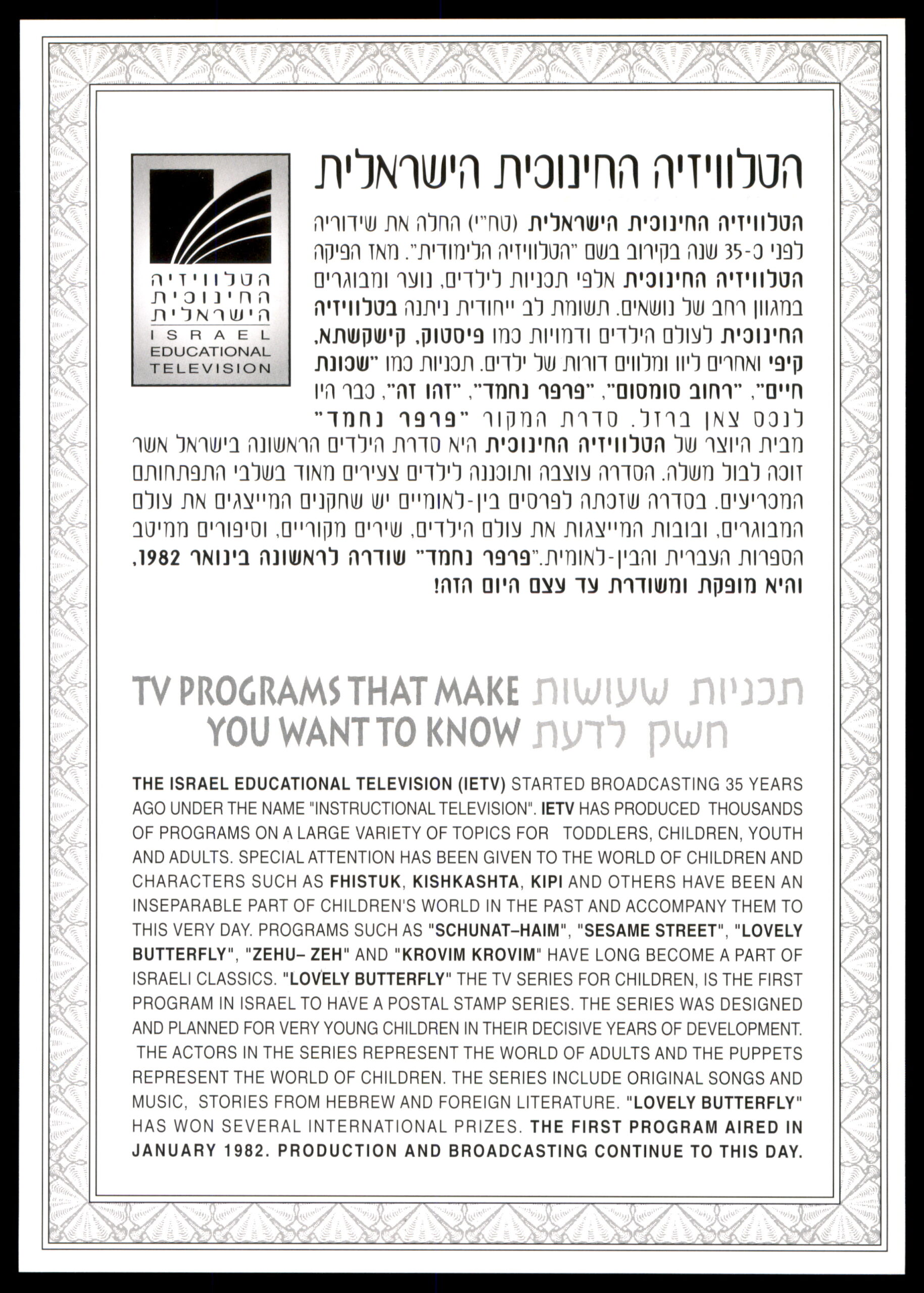 עב: דף מזכרת (מהדורה 1010, מספר 0221) של רשות הדואר הישראלית, לציון 35 שנה לטלוויזיה החינוכית הישראלית. עם בולים צבעוניים בנושא "Lovely Butterfly / פרפר נחמד " (דמויות ילדים מצוירות: פרפרים, חיות, ציפורים). חותמת תל אביב-יפו, 22.6.1999 (כב תמוז תשנ"ט). עיצוב קשת וגלי שידור לילדים. פריט בולאי מקסים של היסטוריה תרבותית-תקשורתית ישראלית.