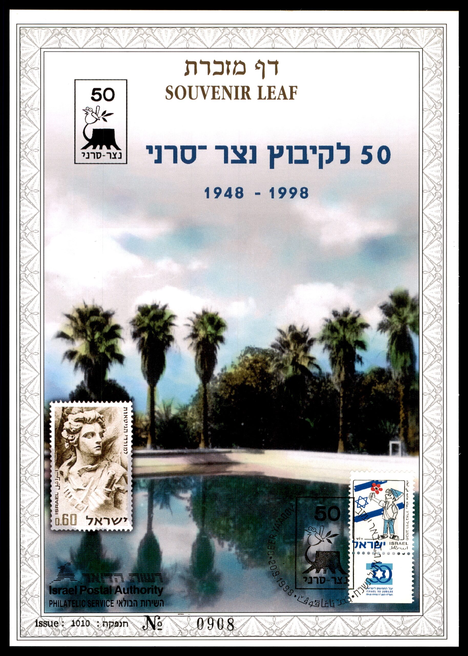 EN: Israel Postal Authority Souvenir Leaf (דף מזכרת), Issue 1010, No. 0908, marking the 50th anniversary of Kibbutz Natzar-Sireni (1948-1998). Features a scenic color photo of the kibbutz grounds with palm trees and reflective pool. Stamps: Israel 0.60 shekel ancient sculpture stamp and Israel 50 stamp with kibbutz emblem. Special commemorative cancellation. A charming piece of Israeli communal history philately.