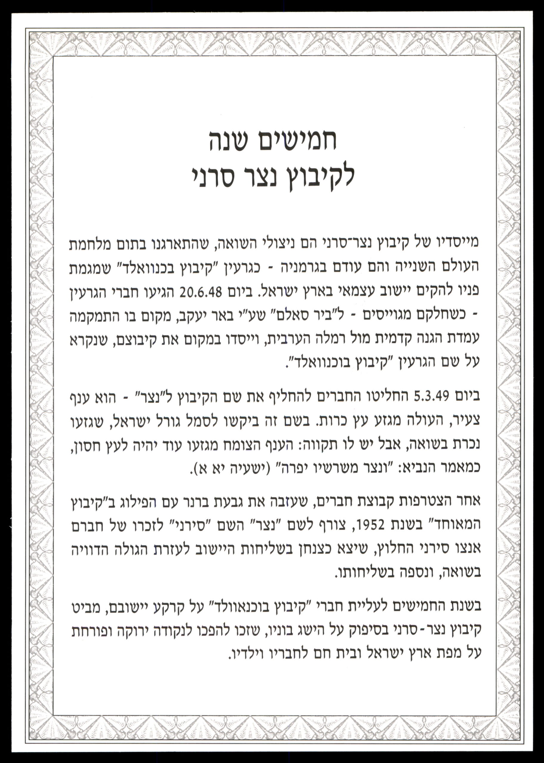 עב: דף מזכרת (מהדורה 1010, מספר 0908) של רשות הדואר הישראלית, לציון 50 שנה לקיבוץ נצר-סרני (1948-1998). עם תמונת צבע יפה של שטחי הקיבוץ עם עצי דקל ובריכה. בולים: ישראל 0.60 ש"ח פסל עתיק ובול ישראל 50 עם סמל הקיבוץ. חותמת זיכרון מיוחדת. פריט בולאי מרתק מההיסטוריה הקיבוצית הישראלית.