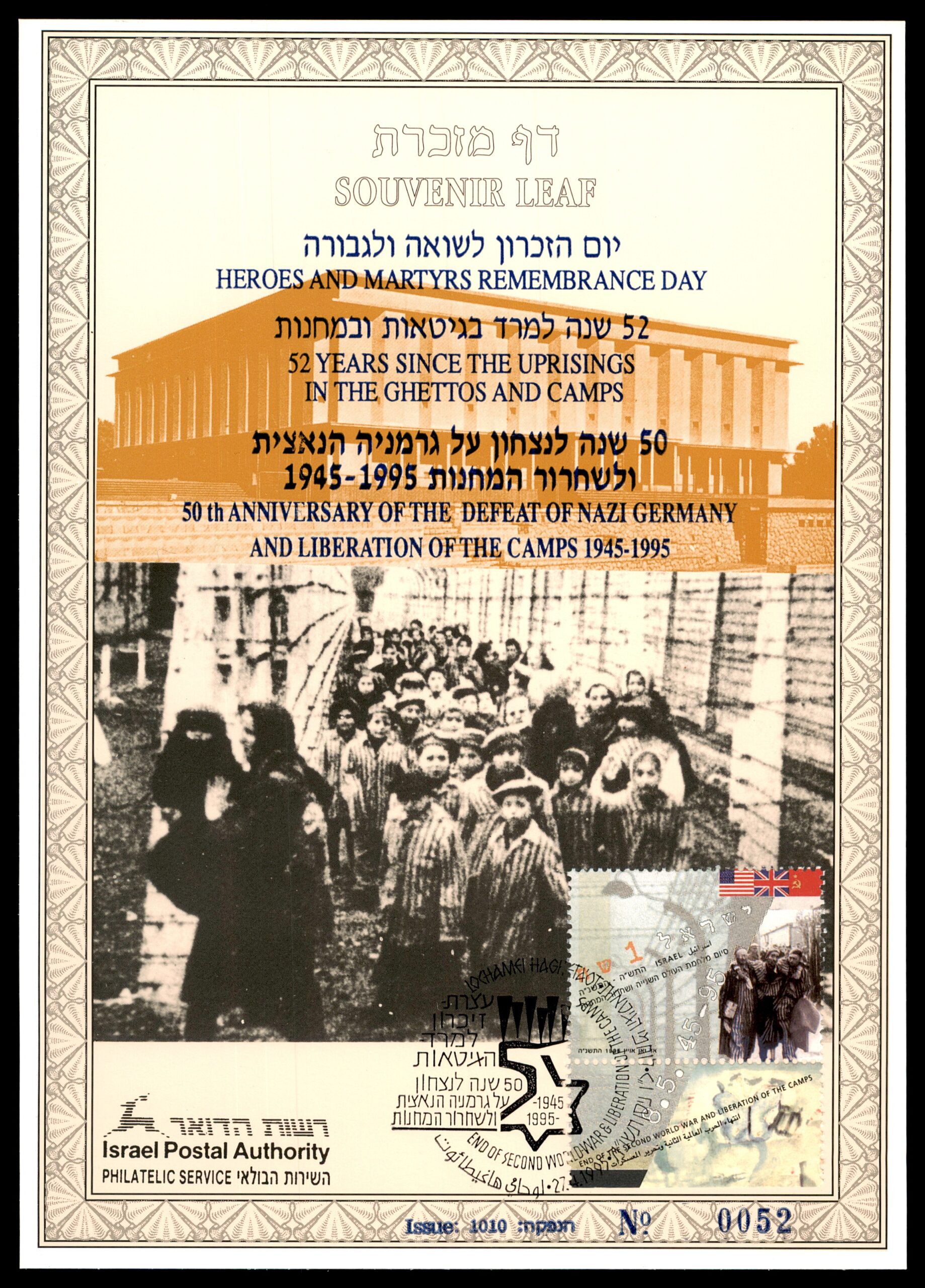 עב: דף מזכרת (מהדורה 1010, מספר 0052) של רשות הדואר הישראלית. יום הזכרון לשואה ולגבורה: "52 שנה למרד בגיטאות ובמחנות" ו"50 שנה לנצחון על גרמניה הנאצית ולשחרור המחנות 1945-1995". עם תמונה היסטורית של שבויים משוחררים, בניין יד ושם ובולים עם דגלי בעלות הברית. פריט בולאי בעל חשיבות עמוקה לזיכרון השואה ומלחמת העולם השנייה, 1995.