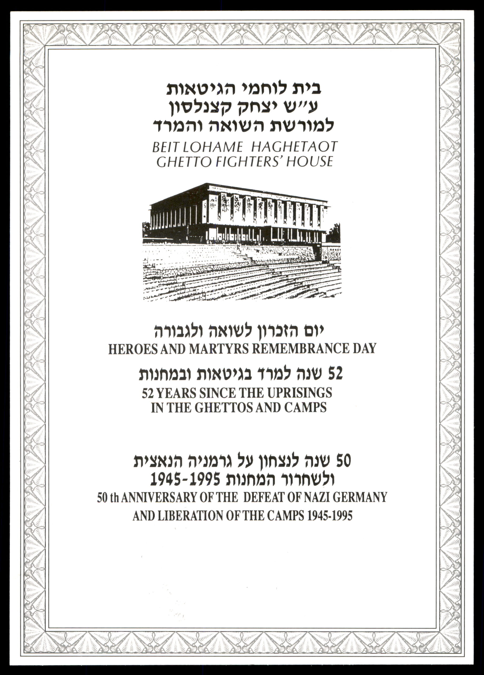 Lot 19 – Israel Souvenir Leaf: Holocaust Remembrance Day, 52 Years Ghetto Uprisings & 50th VE Day, 1995 | דף מזכרת: יום השואה, 52 שנה למרד, 50 לנצחון