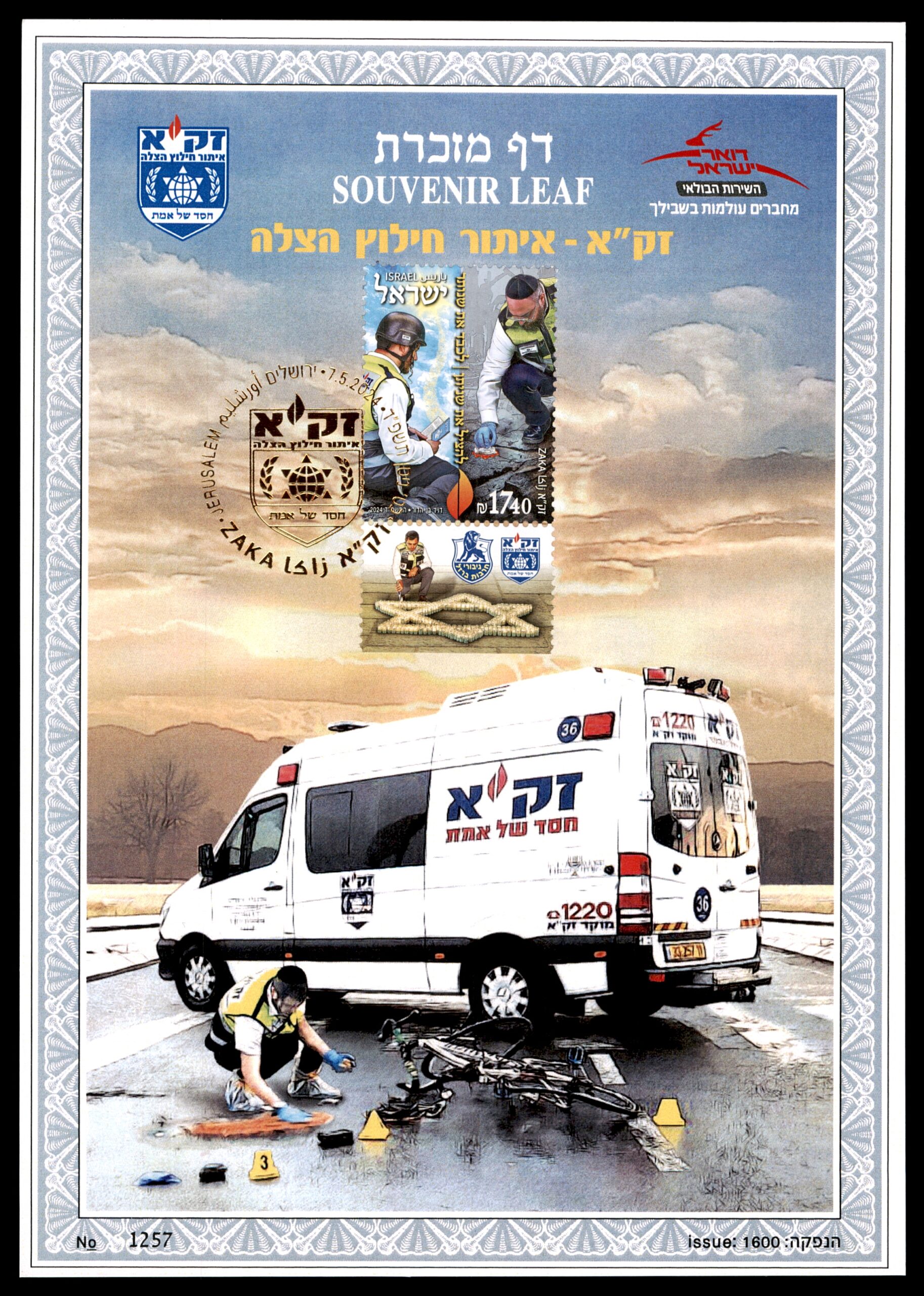 EN: Israel Postal Service Souvenir Leaf (דף מזכרת), Issue 1600, No. 1257, honoring ZAKA (Identification, Rescue and Recovery – זק"א חסד של אמת), Israel's volunteer emergency response organization. Features a ZAKA ambulance/response van at an accident scene with a ZAKA volunteer at work. Israel stamp 17.40 NIS with ZAKA rescue workers. Special ZAKA cancellation. Important Israeli humanitarian and volunteer organization philatelic item.