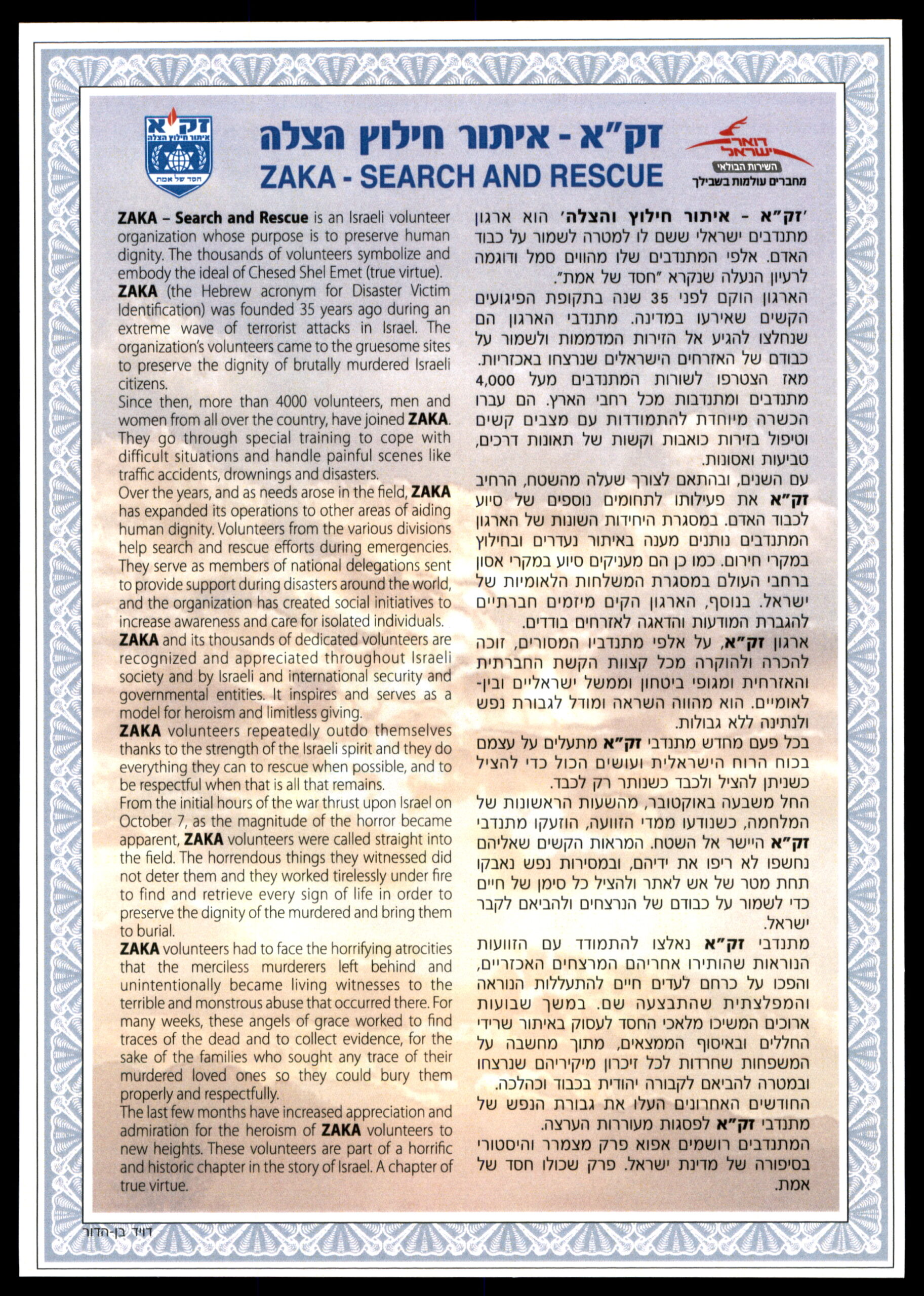 Lot 2 – Israel Souvenir Leaf: ZAKA – Identification, Rescue and Recovery Organization | דף מזכרת ישראל: זק"א – איתור חילוץ הצלה