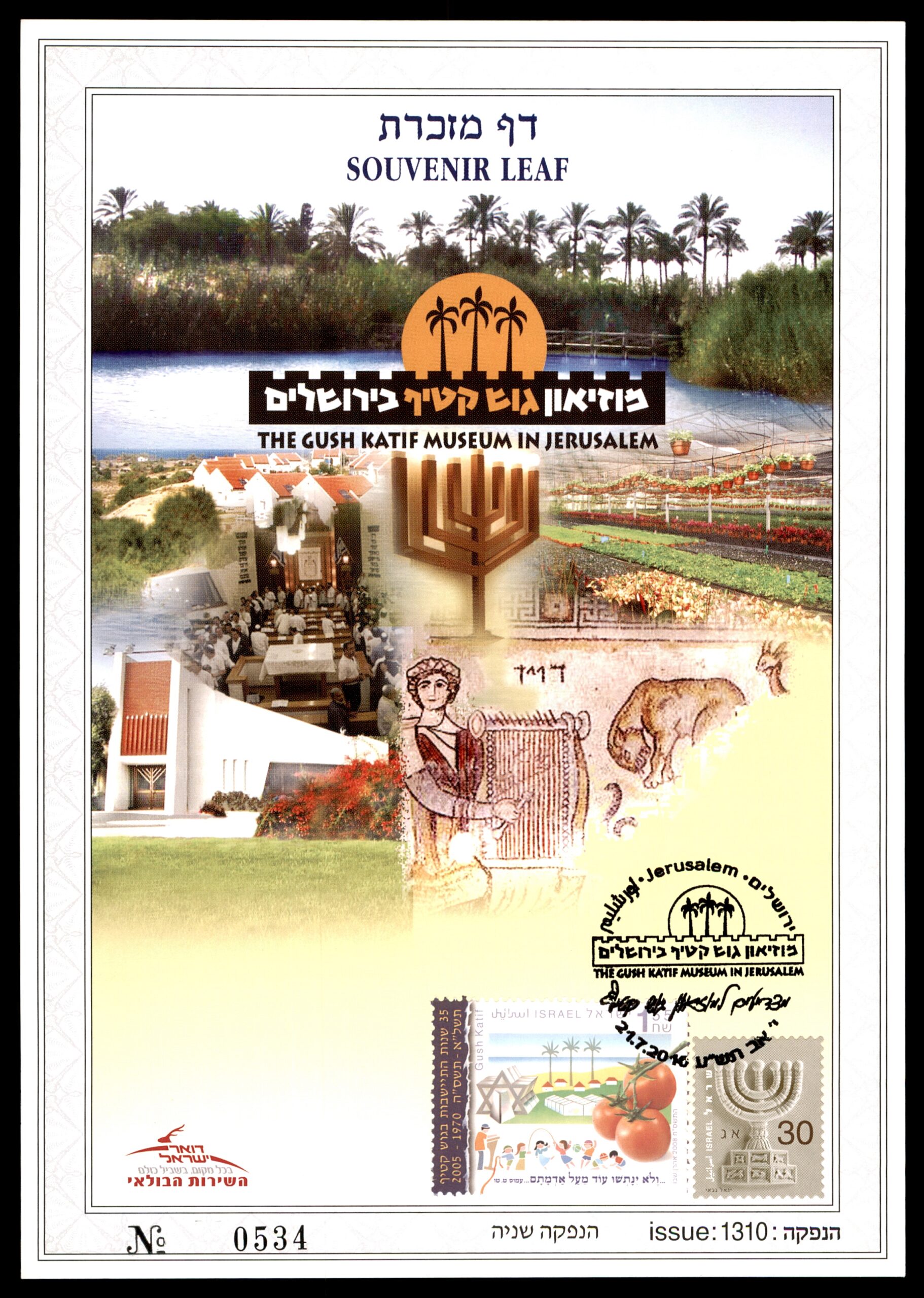 EN: Israel Postal Service Souvenir Leaf (דף מזכרת), Issue 1310 (second edition), No. 0534, for the Gush Katif Museum in Jerusalem (2016). Features photos of the former Gush Katif settlement in Gaza: date palm groves, lush agricultural fields, a Menorah, and an ancient mosaic floor. Israel stamp 30 NIS. Special Gush Katif Museum, Jerusalem cancellation dated 24.7.2016. Commemorates the evacuated Jewish communities of Gush Katif.