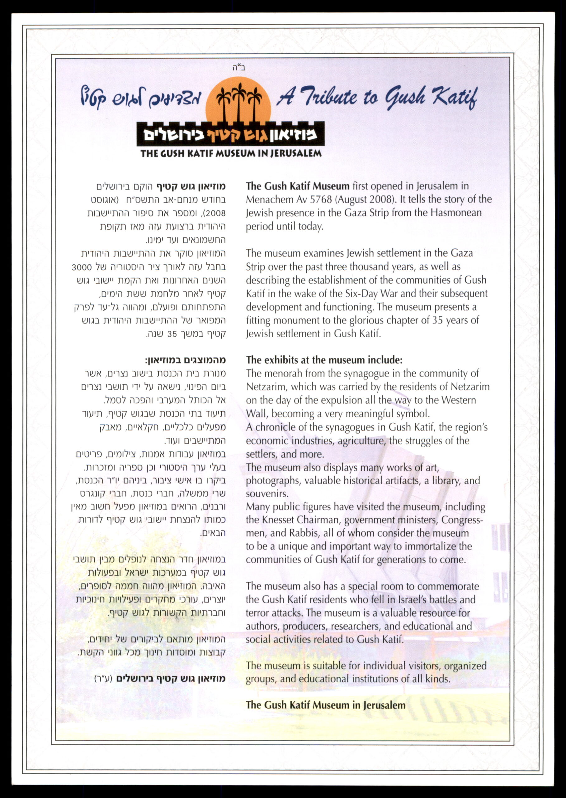 עב: דף מזכרת (הנפקה 1310, הנפקה שנייה, מספר 0534) של שירות הבולים הישראלי, למוזיאון גוש קטיף בירושלים (2016). עם תמונות ישוב גוש קטיף בעזה לשעבר: חורשות דקלים, שדות חקלאיים, מנורה ורצפת פסיפס עתיקה. בול ישראל 30 ש"ח. חותמת מיוחדת מוזיאון גוש קטיף ירושלים, 24.7.2016. מנציח את קהילות גוש קטיף שפונו.